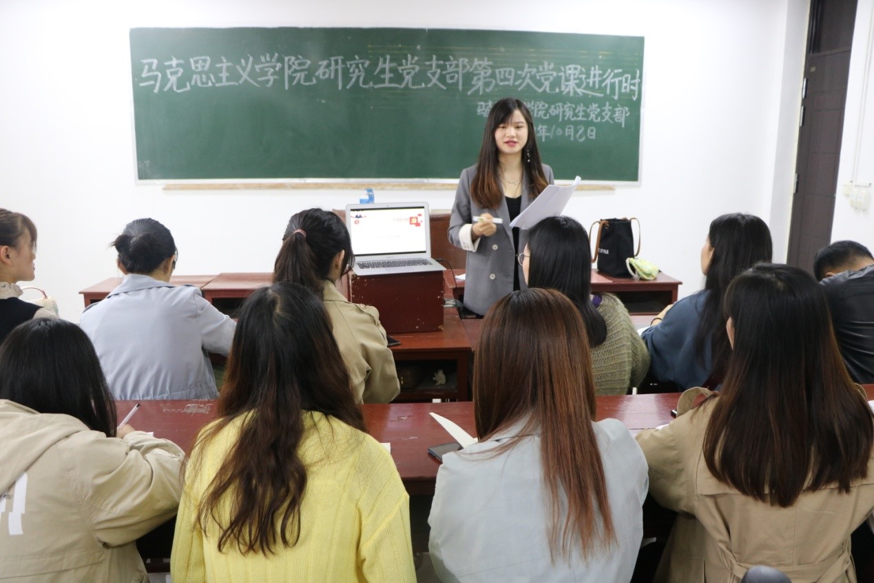 10月8日下午,永利集团官网研究生党支部副书记易思铭在教五楼201教室以《不忘初心 牢记使命 用行动践行新时代庄重宣言》为题,给全体党员和入党积极分子上了一次生动丰富的“不忘初心、牢记使命”主题教育专题党课,党课由研究生党支部书记卢云晓主持。