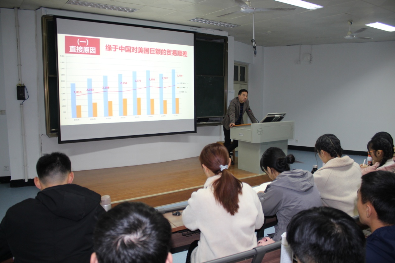 11月21日晚上,永利集团官网2019年研究生学术活动月“读原著学原文悟原理”系列校内讲座第三场在人文楼408教室举行,由王帆宇博士做《新时代中国外交面临的机遇、挑战与对策——以中美贸易摩擦为例》专题讲座。学院全体研究生参加了讲座。