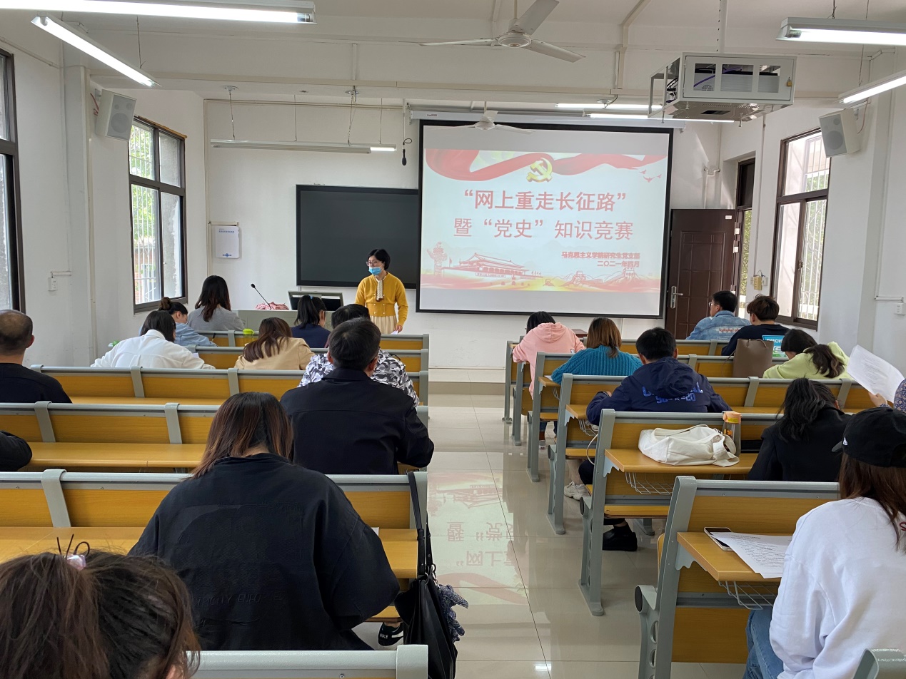 为深入贯彻落实习近平总书记在党史学习教育动员大会上的重要讲话精神,引导广大党员同志感悟百年辉煌党史,坚定理想信念。4月27日下午,在教五203教室永利集团官网研究生党支部开展“网上重走长征路”暨“党史“知识竞赛答题活动,支部全体党员、入党积极分子参加此次活动,活动由支部书记郑晨霞老师主持。