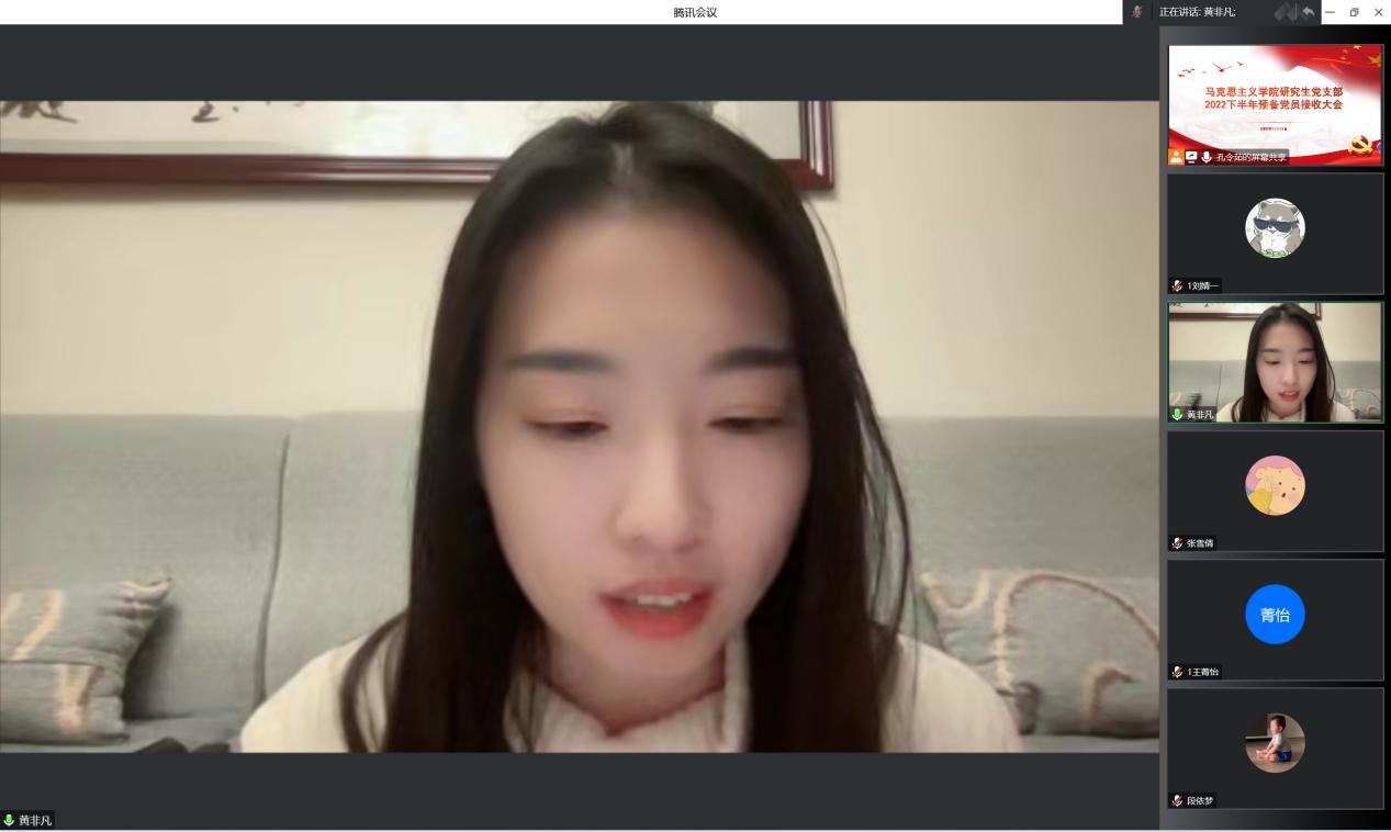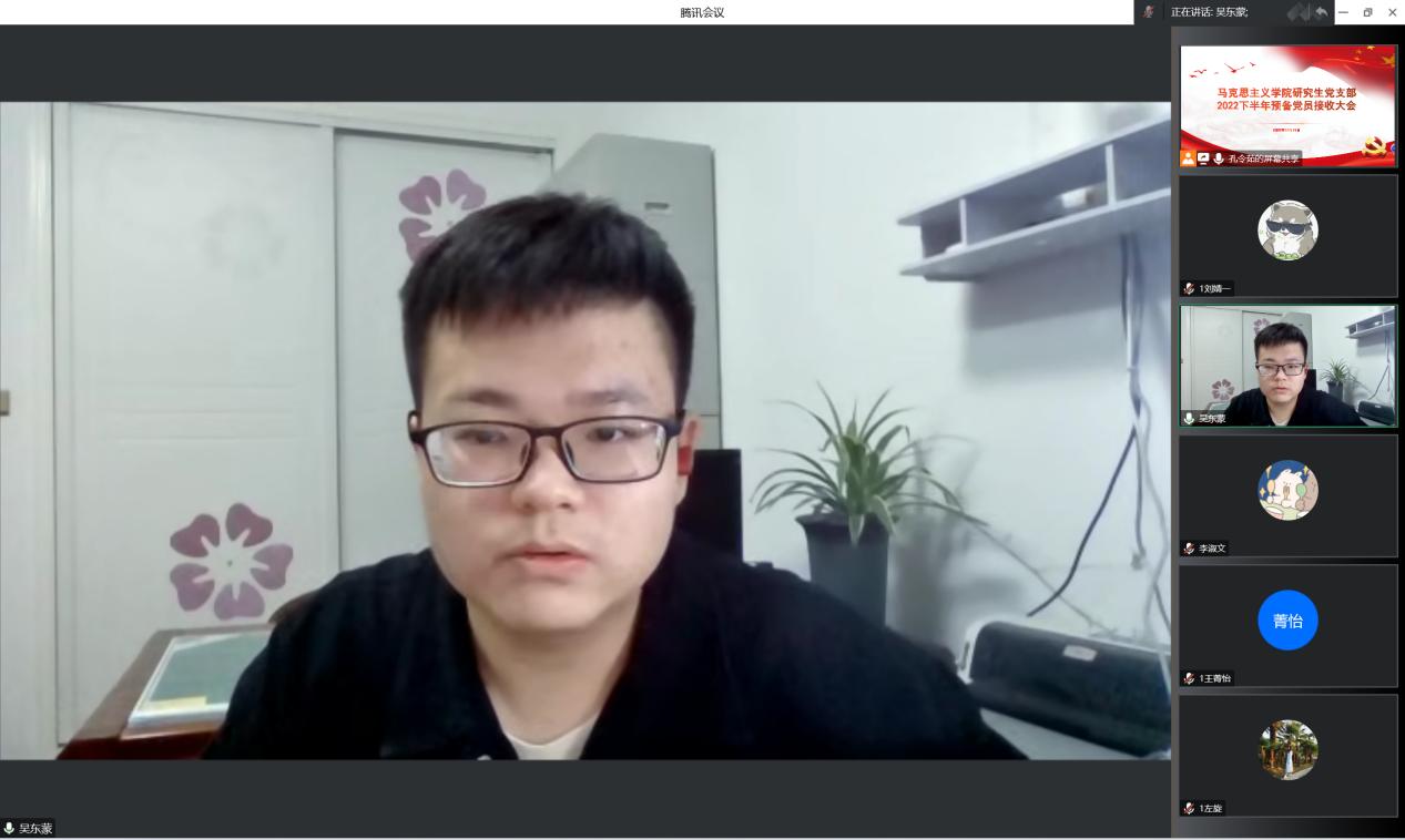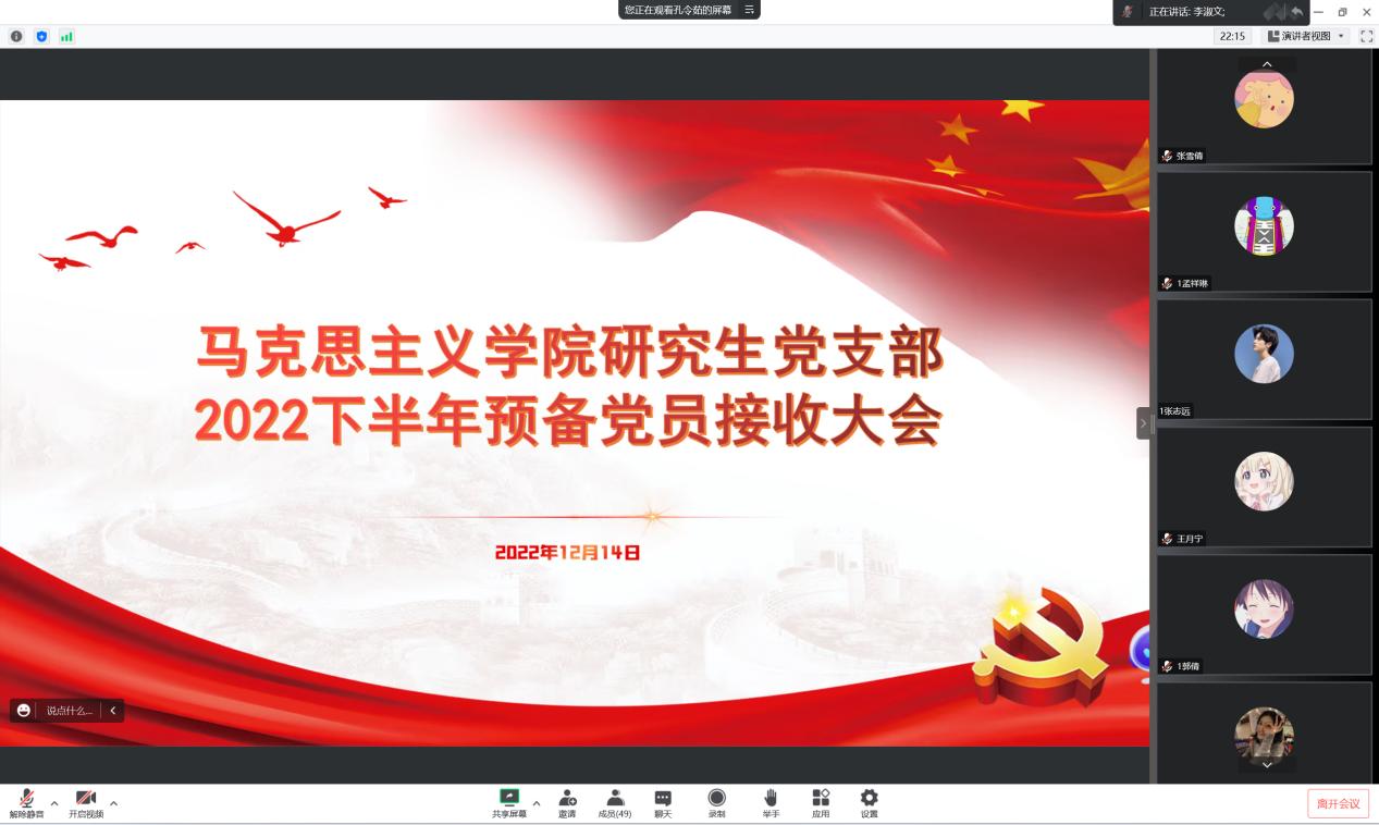 12月14日下午,永利集团官网研究生党支部于线上召开2022下半年预备党员接收大会,讨论了李淑文、吴东蒙、段依梦、张雪倩、黄非凡、王月宁、毛伟威七位同志转为中共预备党员的问题。本次会议由组织委员孔令茹主持,监票人由宣传委员刘婧一担任,计票人由小组长张晓勤担任。