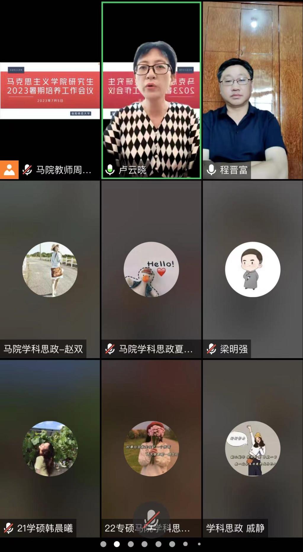 暑期将至,为进一步做好研究生暑期安全教育管理工作,依据学校工作要求,结合研究生实际,永利集团官网于7月5日通过线上线下相结合的方式开展了2023年暑期培养工作安排会议。副院长程晋富、教学秘书卢云晓、班主任周钰婷,以及全体在校研究生参加了本次会议。