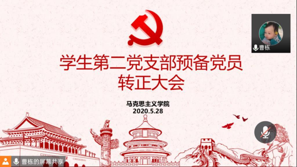 5月28日上午11:00,永利集团官网学生第二党支部在网上顺利召开了预备党员转正大会,大会讨论关于张雅琼等4名预备党员申请转为正式党员的事宜。学生第二党支部支部书记曹栋、入党介绍人陶青青、杨胜利、全体党员和预备党员共28人参加了此次会议。会议由曹栋主持。