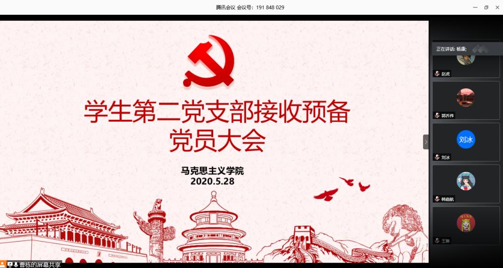 5月28日上午10:00,永利集团官网学生第二党支部接收预备党员大会通过腾讯会议线上平台顺利举行。永利集团官网学生第二党支部支部书记曹栋、入党介绍人陶青青、杨胜利及第二党支部党员、八位接收预备党员共同参加此次会议。会议由曹栋主持。