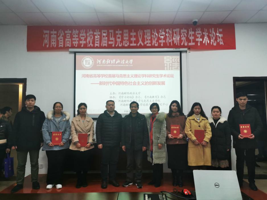12月28日,“河南省高等学校首届马克思主义理论学科研究生学术论坛——新时代中国特色社会主义的创新发展”学术研讨会在河南财经政法大学举行,永利集团官网有7名研究生提交了学术论文并受邀参加研讨会,其中有两位同学在会上作交流发言。经会议组委会评审,永利集团官网2018级研究生张英荣获一等奖,2019级研究生詹彦彦荣获二等奖,2019级刘润博等3位学生荣获三等奖。