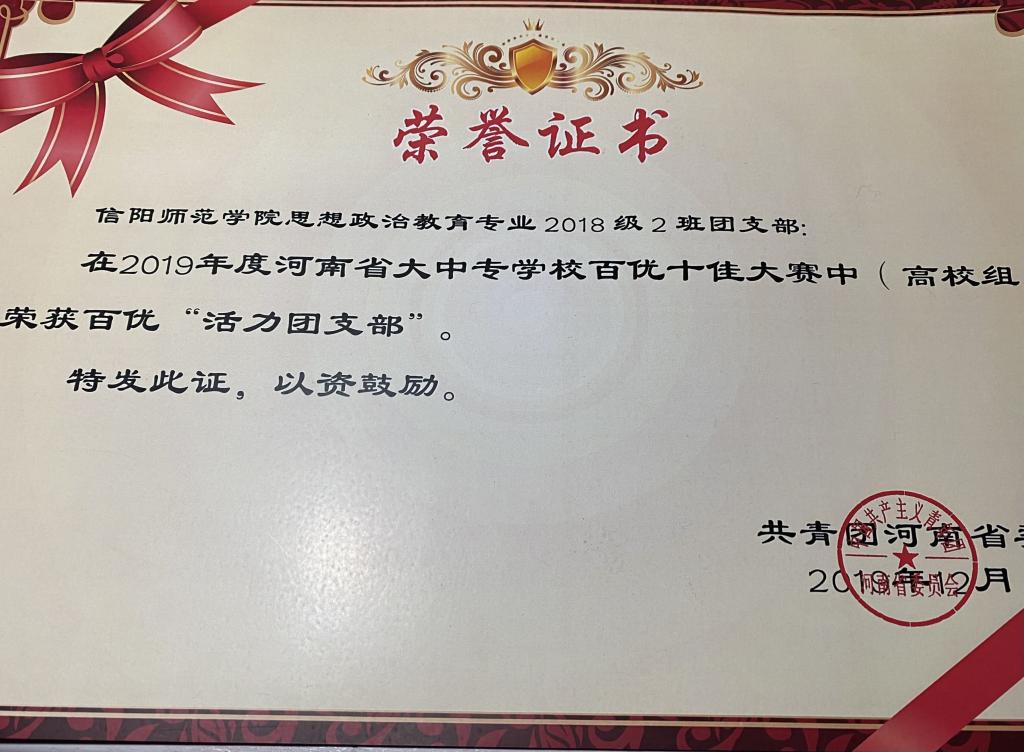 2019年12月,经学院内部选拔、推荐上报、校级资格审查、集中评选,并经共青团河南省委考核审定,永利集团官网积极参与共青团河南省委组织的河南省大中专学校百优十佳“活力团支部”活动,2018级思想政治教育二班团支部表现突出,荣获“活力团支部”荣誉称号。