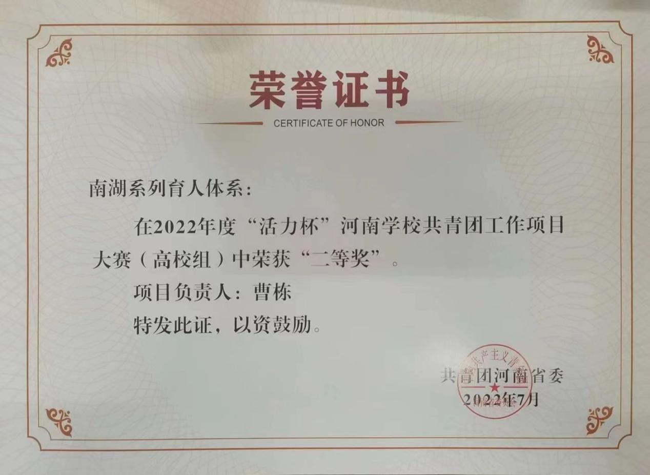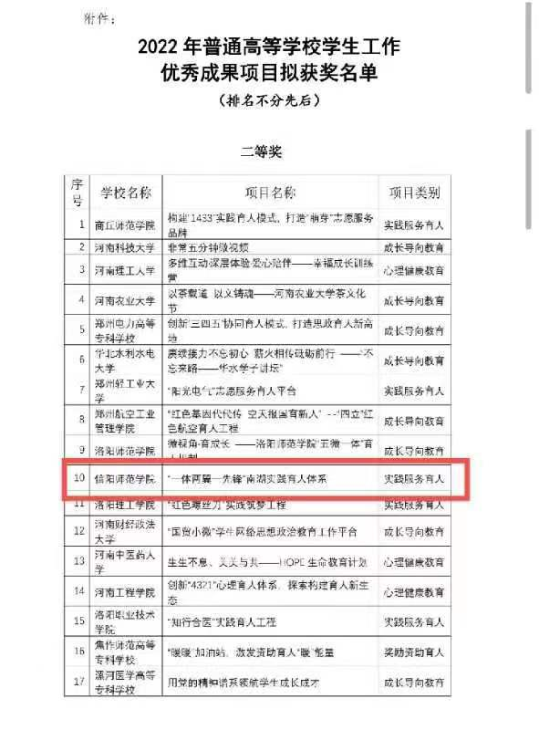 为深入学习贯彻党的二十大精神,河南省教育厅办公室组织开展了2022年普通高等学校学生工作优秀成果项目评选活动。永利集团官网“一体两翼一先锋”实践育人体系以脚踏实地的态度、先进的理论指导、丰富多彩的育人活动获得2022年普通高等学校学生工作优秀成果项目拟获奖二等奖。