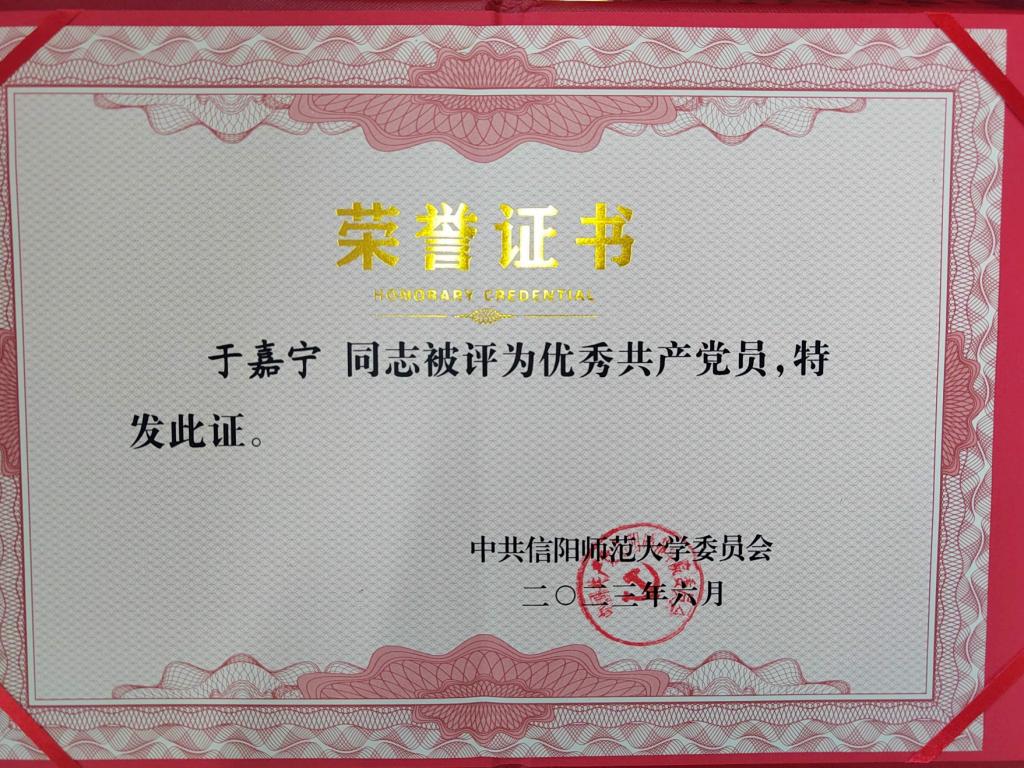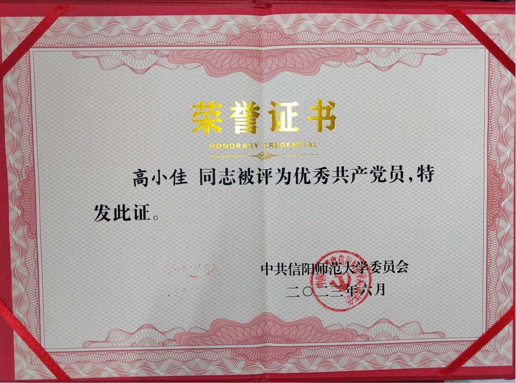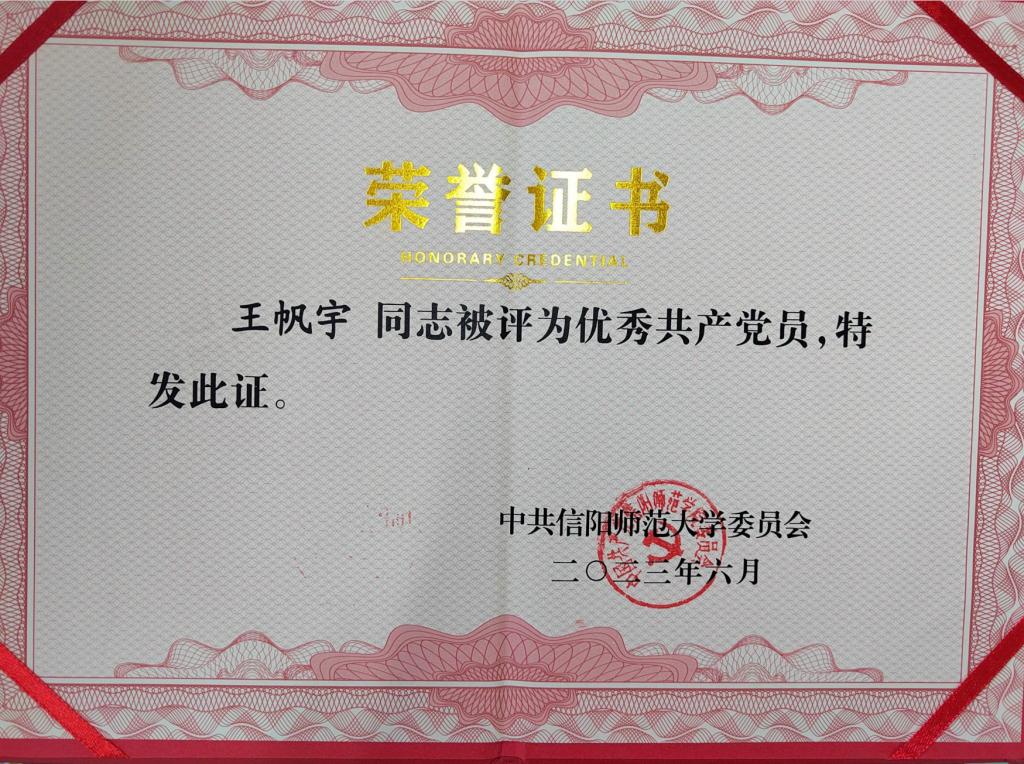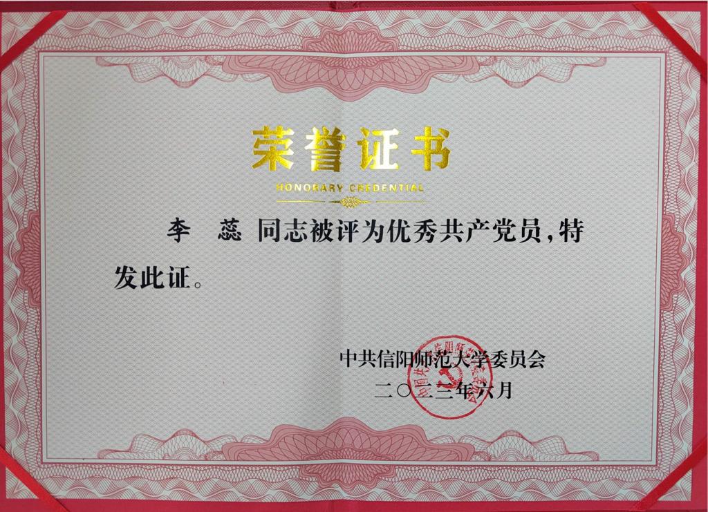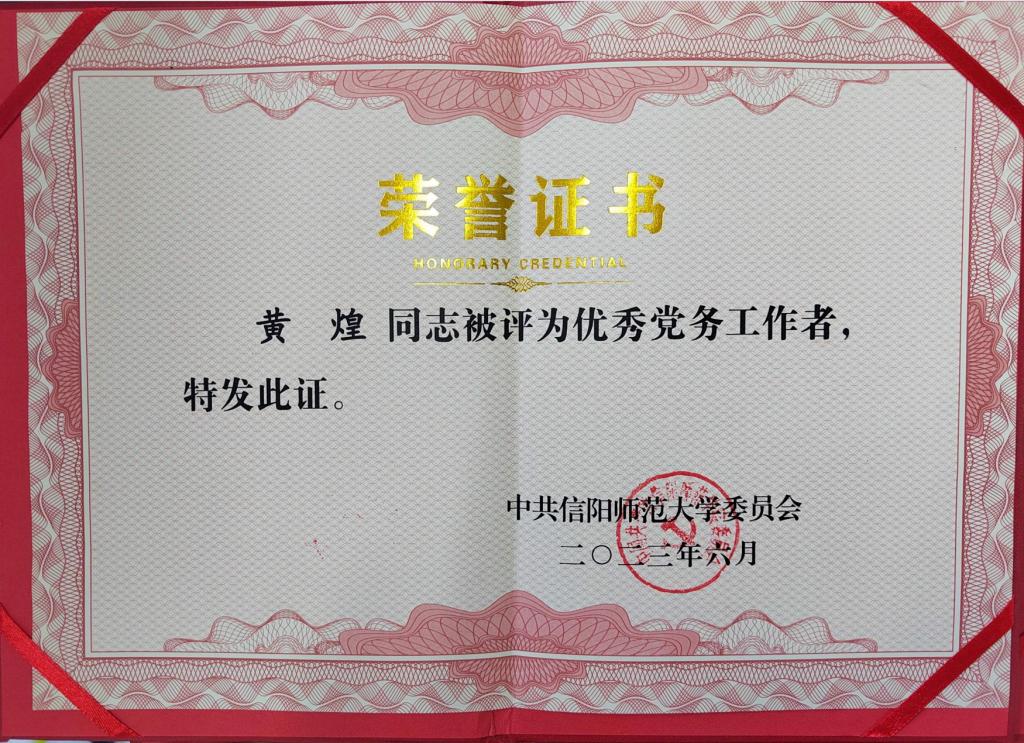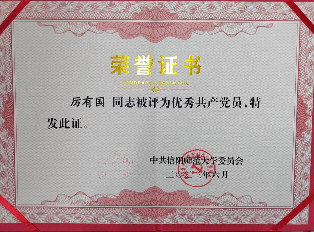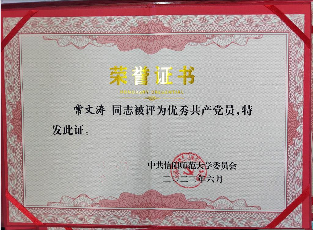 2023年6月,永利集团官网黄煌同志被评为信阳师范大学优秀党务工作者;永利集团官网李蕊、厉有国、常文涛、王帆宇、高小佳同志被评为信阳师范大学优秀共产党员;永利集团官网本科生于嘉宁同志被评为优秀共产党员。