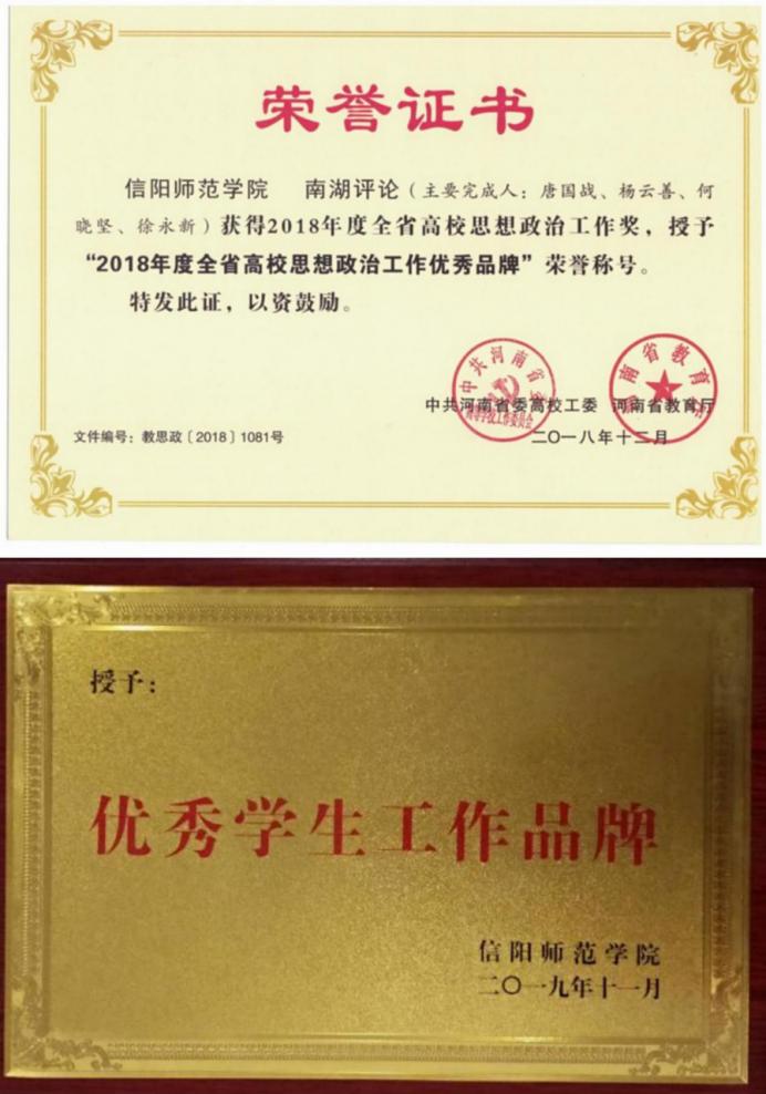 为提高永利集团官网学生核心竞争力,增强学生对时政新闻的关注度和思考能力,进一步提高思想政治教育专业学生的表达能力和写作能力,在学院党委领导下,永利集团官网创办《南湖评论》刊物,目前已发刊9期,为学生写作提高提供广阔的平台。2018年12月,《南湖评论》获2018年度全省高校思想政治工作优秀品牌。2019年11月,经各位专家评委评定,永利集团官网“南湖”系列育人体系荣获信阳师范学院“优秀学生工作品牌”。《南湖评论》是永利集团官网为培养学院学生的专业素养,为学生在马言马、在马信马、在马爱马搭建平台,提升学生的理论水平和党性修养;为培养社会主义事业合格的建设者和接班人贡献力量,提升学院学生核心竞争力所创办的评论性刊物。