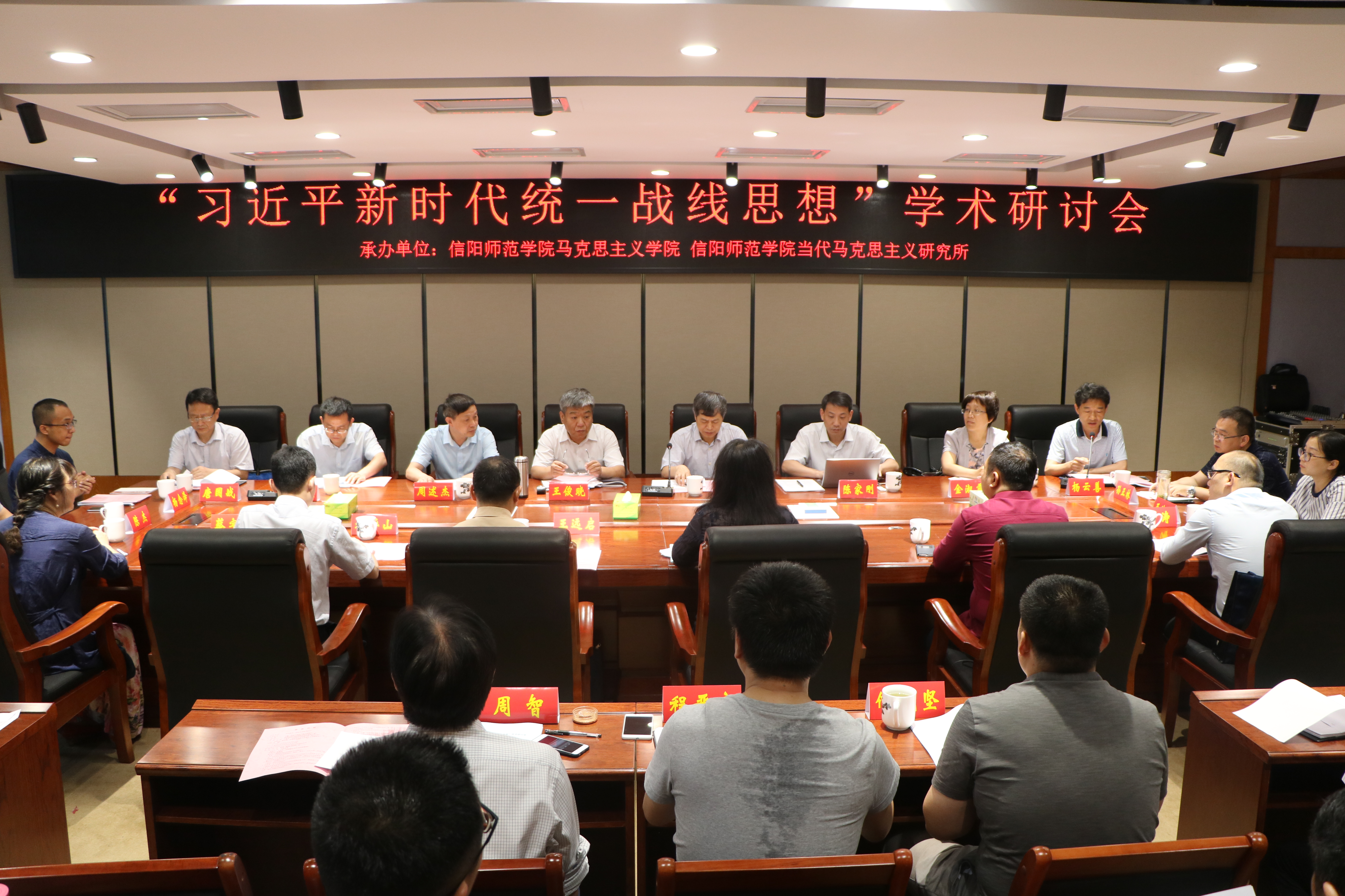 为深入学习习近平新时代统一战线思想,5月19日,由信阳师范学院永利集团官网和当代马克思主义研究所共同承办的“习近平新时代统一战线思想”学术研讨会在我校逸夫楼三楼会议室隆重召开。校长李俊、河南省社会主义学院副院长王俊晓、湖南省社会主义学院副院长周述杰、中央党史和文献研究院研究员陈家刚、复旦大学统战理论研究基地副秘书长肖存良、山东大学当代社会主义研究所办公室主任金淑霞