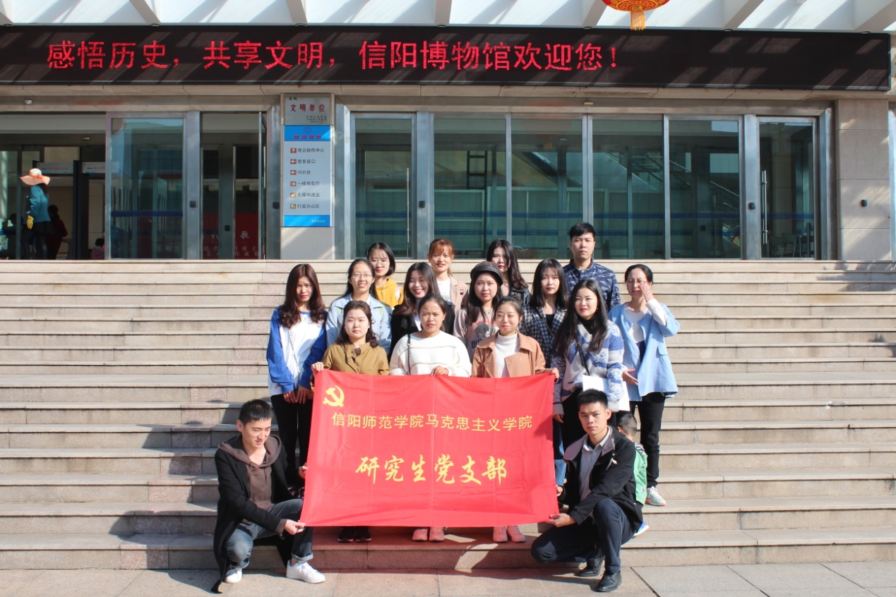 为丰富“不忘初心、牢记使命”主题教育活动形式,10月19日上午,研究生党支部组织全体党员和部分学生来到信阳市博物馆,通过感悟历史、共享文明,开展“守初心、担使命、筑青春”主题党日活动。