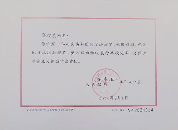 保家卫国终无悔,绿色军营献青春。2020年9月1日,永利集团官网张怡兵同学收到河南省人民政府征兵办公室印发的入伍通知书,光荣参军入伍,实现永利集团官网征兵工作的“零”突破。