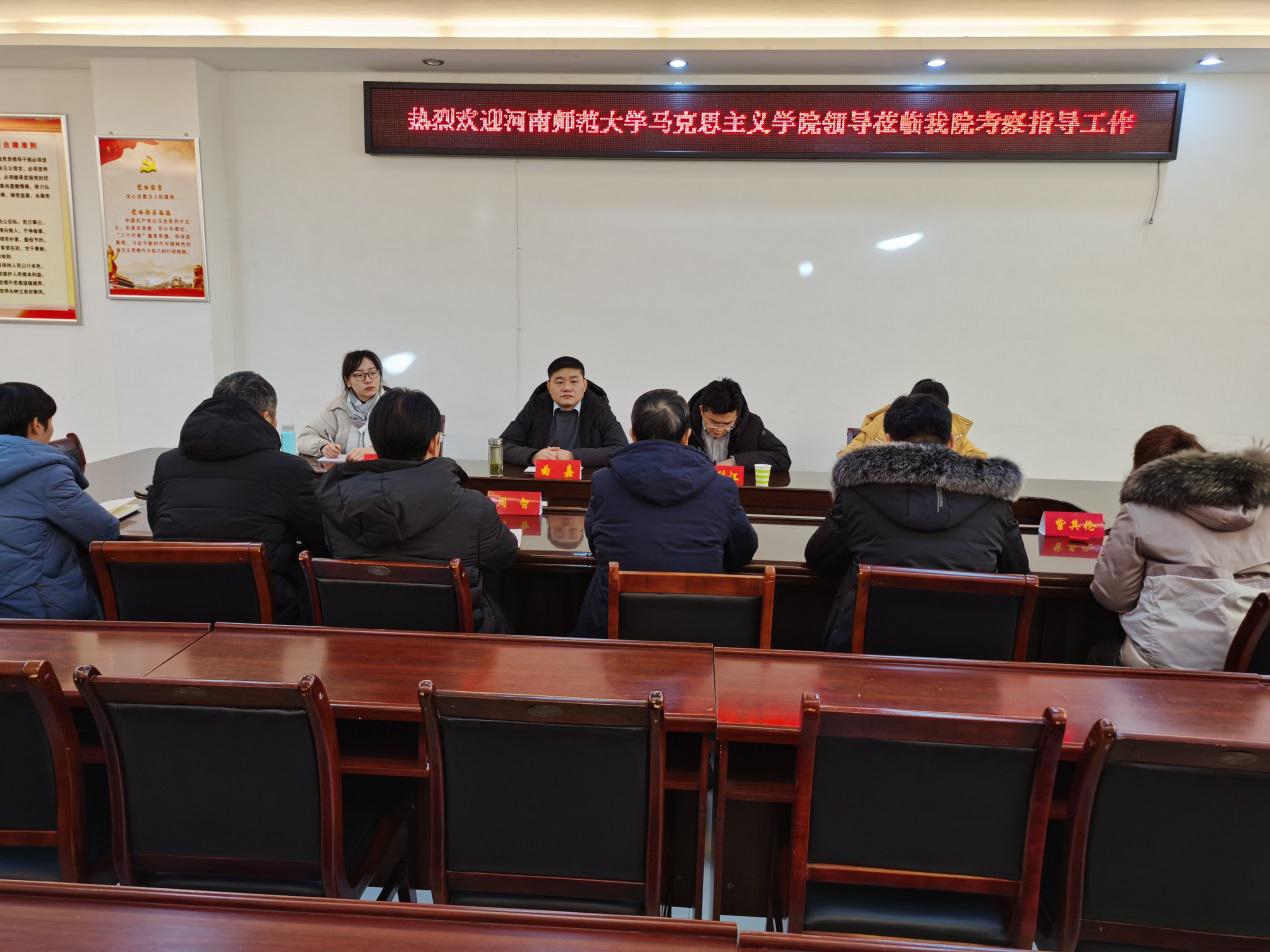 2021年1月8日上午,河南师范大学永利集团官网副院长曲嘉一行4人来永利集团官网考察交流思想政治教育专业建设工作。永利集团官网党委书记唐国战、副院长周智、当代马克思主义研究所副所长兼党委副书记徐永新、副院长程晋富、思想政治教育系主任李蕊及教学办公室人员出席了交流会。会议在社科楼323会议室进行,由党委书记唐国战主持。