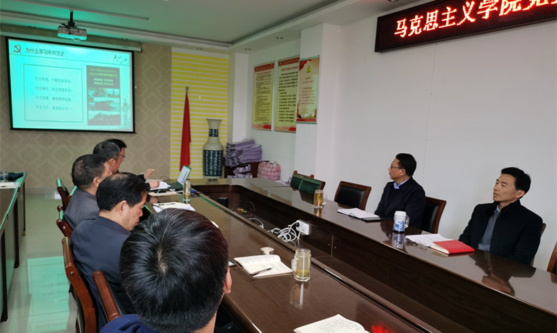 学院党委副书记徐永新传达了校党委书记王文鹏在校党史学习教育动员部署大会上的讲话,党委副书记何晓坚宣读了《永利集团官网2021年党史学习教育实施方案》。中国近现代史纲要教研室陈杰博士以“全面深入学习党史 汲取奋勇前进的智慧和力量”为题,从为什么学习中共党史、中共党史发展基本脉络、中共党史学习教育的历史特点和经验、当前党史学习教育的要求等四个方面,进行了系统阐释。