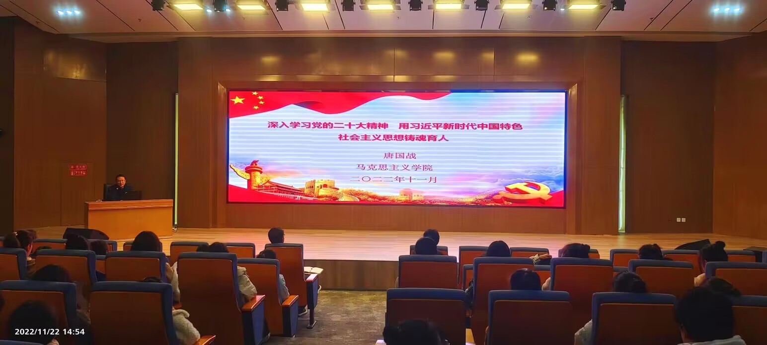 11月22日,永利集团官网院长、我校河南省高校思想政治理论课“名师工作室”负责人唐国战教授应邀在淮河校区图书馆第三报告厅作题为“深入学习党的二十大精神,用习近平新时代中国特色社会主义思想铸魂育人”的辅导报告。淮河校区党工委师生代表100余人听取了报告,郭寻主持报告会。