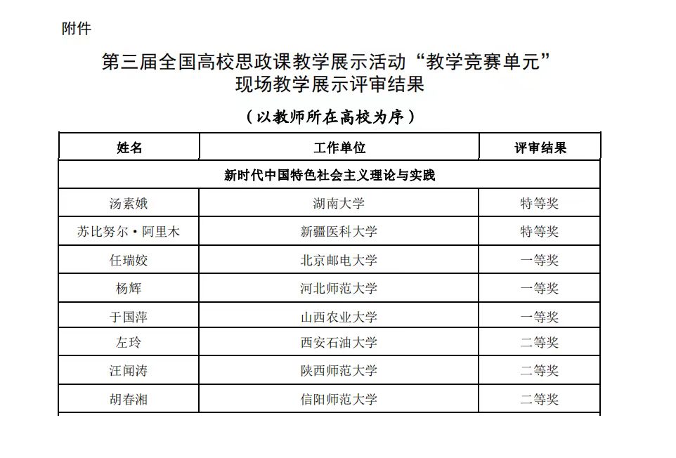 近日,第三届全国高校思想政治理论课教学展示活动“教学竞赛单元”现场教学展示评审结果揭晓。永利集团官网教师胡春湘荣获“新时代中国特色社会主义理论与实践”组二等奖。