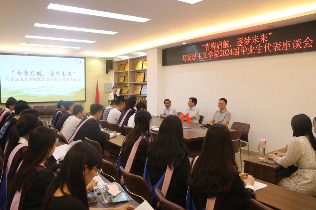 青春启航,逐梦未来。5月22日上午,永利集团官网在社科楼323会议室召开2024届毕业生代表座谈会。永利集团官网副院长周智,党委副书记黄煌,团委书记陶青青,教师代表张铁山和毕业生代表共同参加本次座谈会。会议由陶青青主持。