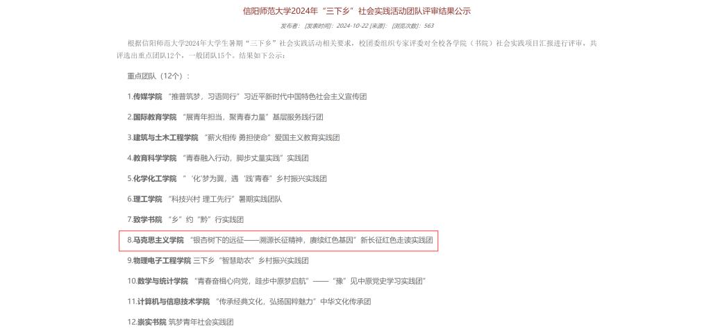 近日,信阳师范大学2024年“三下乡”社会实践活动团队评审结果公示。此次评选依据相关要求,由校团委组织专家对全校各学院(书院)社会实践项目汇报进行评审,永利集团官网“溯源长征精神,赓续红色基因”新长征红色走读实践团评选为重点团队。