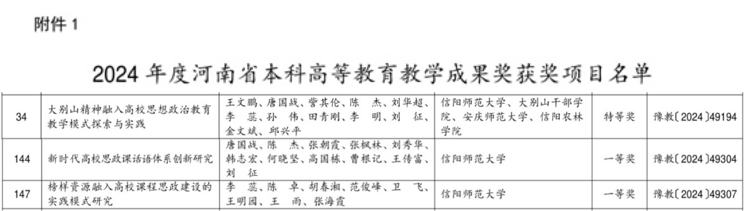 根据国务院《教学成果奖励条例》、《河南省高等教育教学成果奖励办法》及有关申报通知要求,在学校评选校级教学成果奖励的基础上,经学校推荐、专家评审,由我校党委书记王文鹏主持,永利集团官网教师参与申报成果《大别山精神融入高校思想政治教育教学模式探索与实践》荣获特等奖,唐国战院长主持成果《新时代高校思政课话语体系创新研究》,李蕊教授主持成果《榜样资源融入高校课程思政建设的实践模式研究》分别荣获本科高等教育教学成果一等奖。