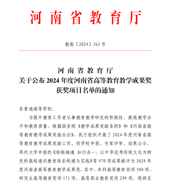 11月21日,河南省教育厅下发了《关于公布2024年度河南省高等教育教学成果奖获奖项目名单的通知》(教高〔2024〕363号),永利集团官网喜获河南省高等教育教学成果奖一等奖两项。