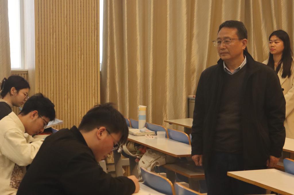 比赛现场气氛热烈,选手们精神饱满、专注投入。他们或执毛笔挥毫泼墨,笔走龙蛇;或握钢笔轻盈运笔,字迹灵动;或拈粉笔潇洒落字,板书端秀;或以简笔随性勾勒,意蕴无穷。学院领导在比赛过程中认真观摩,并与选手们亲切交流。唐国战院长在赛后对选手们的表现给予了肯定,从书法的笔法、结构到简笔画的创意构思等方面进行了专业指导。他强调,“三笔一画”不仅是师范生的基本功,更是中华文化的重要传承载体,希望同学们扎实练习、精益求精,在未来的教育实践中学以致用。