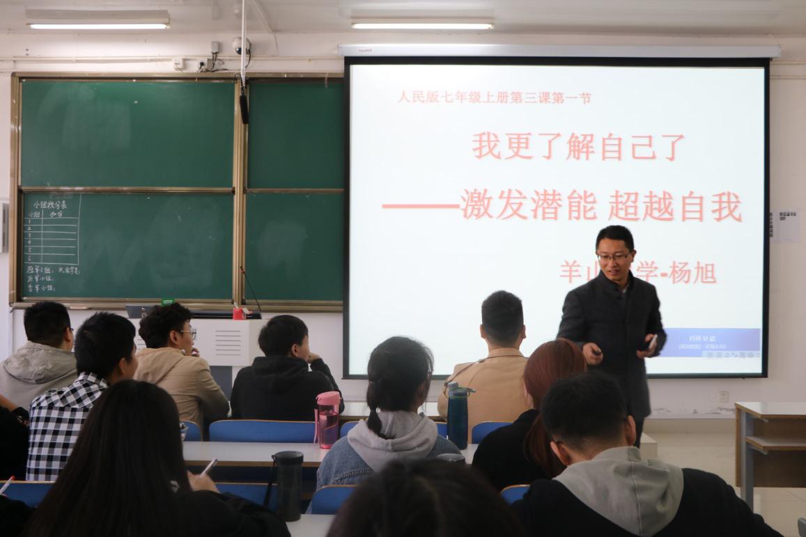 信阳市羊山中学优秀思政课教师杨旭老师以“我更了解自己了——激发潜能 超越自我”为题展开教学。他首先划分了6个课堂活动小组,充分发挥学生主动性,用课前小游戏的方式导入新课,通过问题思考、师生交流、集中讨论、小组发言、成果评比等方面展开教学,展讲了一节生动、互动、精炼、精彩的示范课。本次示范课,着眼于提升学生专业素养、编织教学素材、驾驭教学环节、营造课堂氛围、提升教学效果等方面。通过一线优秀教师讲授示范课,学生们更加直观地感受到了“优质课程是什么样的、如何讲好一堂优质课”,在推动学生自我塑造优秀中学教师方面发挥了积极作用。