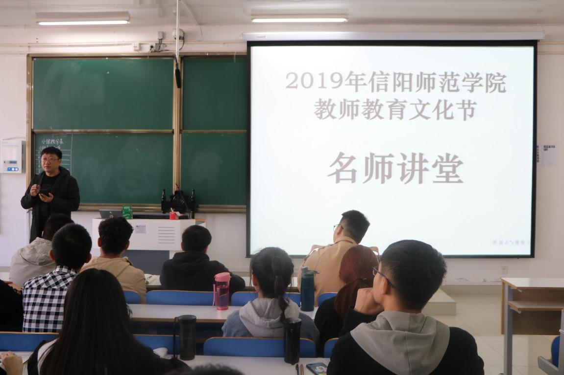 信阳师范学院2019年教师教育文化节系列活动之名师讲堂于2019年10月29日上午9点在社会科学楼516教室举行。该活动由学校教务处主办、永利集团官网承办,邀请信阳市羊山中学高级教师杨旭主讲,永利集团官网副院长程晋富出席并主持本次活动。