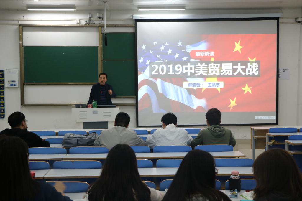 王帆宇以2019中美贸易大战最新解读为题,以美国对华贸易战为主线,分别从贸易战原因、关涉领域、双方影响、前瞻展望及中国对策五方面进行了详细阐述。他引用历史实例揭示孤立主义是美国立国之本,强调中美贸易战的实质是美国对中国崛起的恐惧。接着,王帆宇就贸易战对双方的影响,理性分析了我国目前存在的科技短板,并强调了《中国制造2025》的重要意义。最后,他以央视新闻国际锐评结尾,指出中华民族伟大复兴之梦不会因为中美贸易战而止步不前。