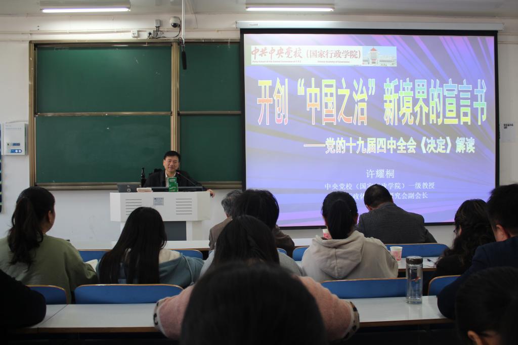 许耀桐以党的十九届四中全会“两个重点”、“三大板块”为切入点,结合自身多年的实践工作经验,从中国之治的国家制度、国家治理、显著优势、根本保障四个方面,深入浅出地对党的十九届四中全会《决定》进行了解读。他着重强调了中国特色社会主义制度是党和人民在长期实践探索中形成的科学制度体系,并详细分析了国家制度建设的“三步走”战略。他指出,坚定不移地坚持中国共产党的正确领导是开创中国之治新境界的基本前提,具有统率向导作用,我们要紧跟党的步伐,促进国家制度的成熟完善。最后,许耀桐详细阐述了中国之治具备的显著优势以及中国社会主义制度建设的光明前景。讲座结束后,门献敏对本次报告会做出总结。他指出,本次报告占位高、视野开阔,集理论的高度、深度、广度于一体,对同学们考研和老师的项目研究具有直接的指导意义。