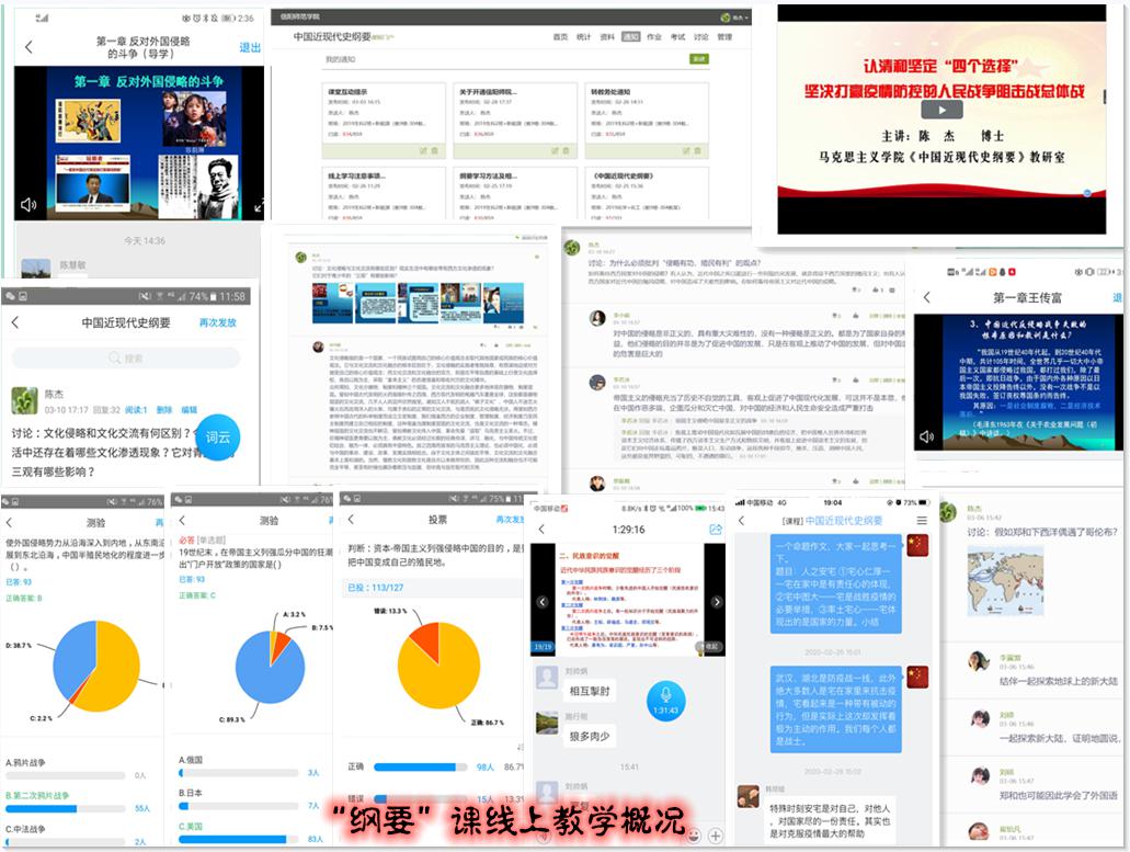 课堂“套餐”:“多元交融”探索微课教学新模式。探索打造“纲要”课“多元交融”的微课模式,是“纲要”教研室响应学校要求、适应在线教学需要而创新的课堂教学形式。多元化、多模式相互交融的课堂“套餐”主要包括:一是线上与线下的学习互动,二是课外与课内的知识互补,三是课堂讨论与自我学习的思考互融,四是教师“教”与学生“学”的角色互换等。“纲要”课打造和实施的“微课”模式,注重了教学资料多样、教学手段多样,注重了线上教学的环节多元、环节互联,实现了线上“直播”、“速课”、“同步课堂”等多模式的教学融合,以信息化、互动性增强了课程教学的吸引力、参与度和教学效果。