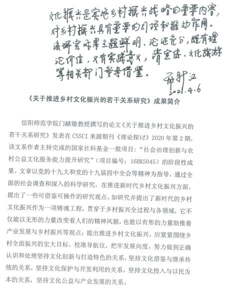 我校永利集团官网门献敏教授撰写的论文《关于推进乡村文化振兴的若干关系研究》发表在CSSCI来源期刊《理论探讨》2020年第2期,该论文是其本人主持完成的国家社科基金目:“社会治理创新与农村公益文化服务能力提升研究”(项目编号:16BKS045)后续研究成果,据悉,这一成果获河南省人大常委会副主任乔新江同志签阅批示。