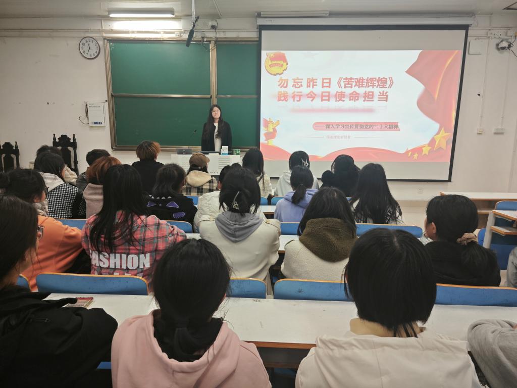 为深入了解中国共产党的历史和伟大成就,培养同学们的担当精神和责任意识,11月10日晚,南湖理论研讨社在社科楼514教室举办了“勿忘昨日《苦难辉煌》,践行今日使命担当”主题团课。团课由团支书武文雪主持,全体社团成员共同参加。