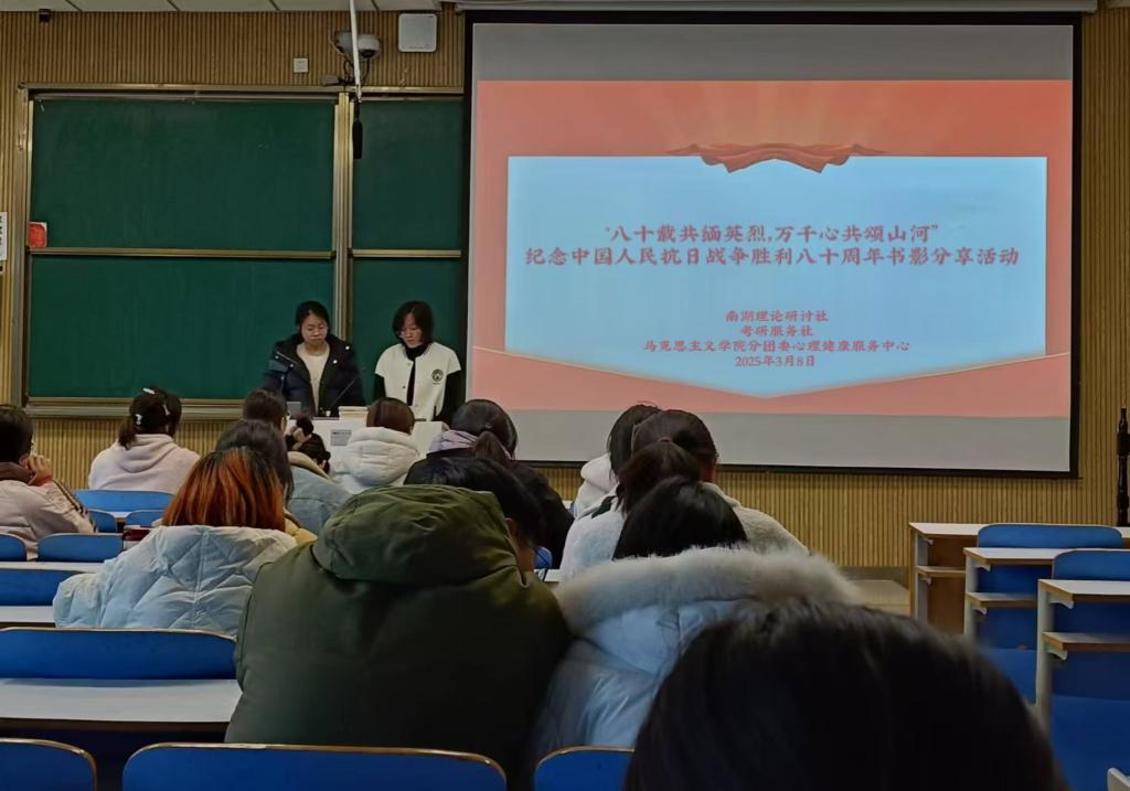 铭记历史光辉,缅怀英雄先烈。为加强爱国主义教育,提升当代大学生民族自豪感,激发学生爱国热情。3月8日,南湖理论研讨社携考研服务社、永利集团官网分团委心理健康服务中心在社科楼515教室联合举办以“八十载共缅英烈,万千心同颂山河”为主题的书影分享活动。本次活动由心理健康服务中心负责人吴玉阳、付雨芳共同主持。