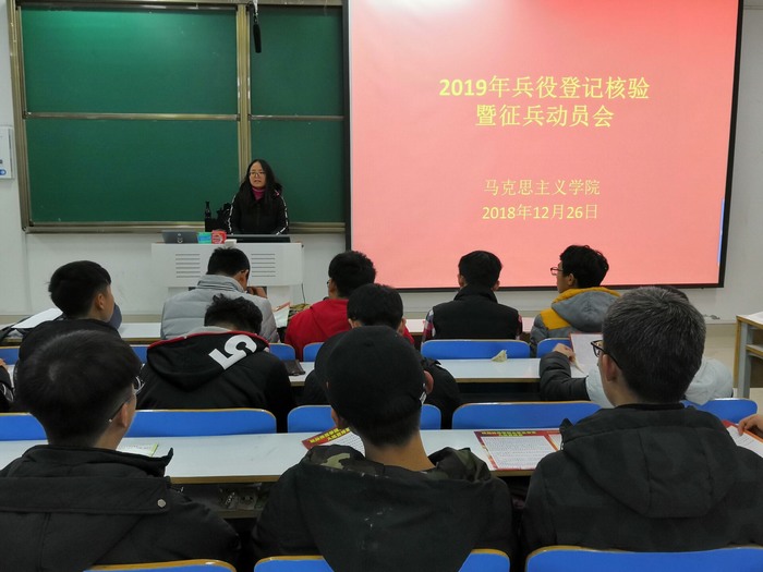国无防不立,民无兵不安。为响应我国大学生征兵工作的号召, 12月26日下午,永利集团官网于社科楼516召开2019年兵役登记核验暨征兵动员会。永利集团官网2018级全体男生参加了本次动员会。本次动员会由武装干部曹菁菁主持。