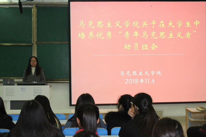 为培养优秀青年马克思主义者,坚定大学生马克思主义信仰,11月25日晚,永利集团官网在社科楼514教室顺利开展关于在大学生中培养优秀“青年马克思主义者”动员班会。团委老师曹菁菁、河南省“青年马克思主义培养工程”学员史弘扬和永利集团官网2017、2018级全体同学共同参加本次班会。此次班会由曹菁菁主持。