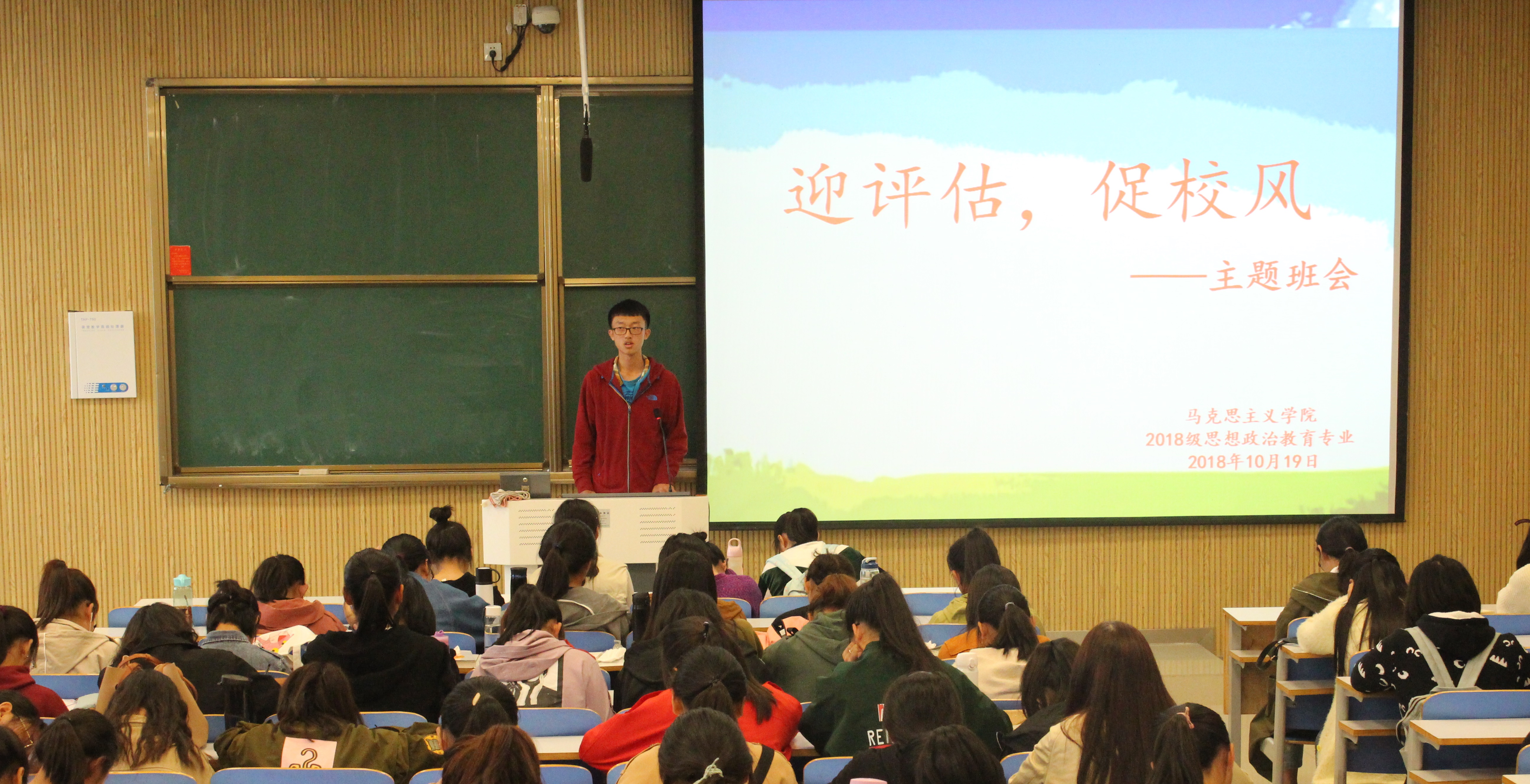 为迎接本科教学评估工作,促进良好校风建设,10月19日上午,永利集团官网2018级在社科楼515教室顺利开展“迎评估,促校风”主题班会。2018级全体同学共同参加了此次班会。班会由思政一班班长邢子豪和思政二班班长杨康主持。