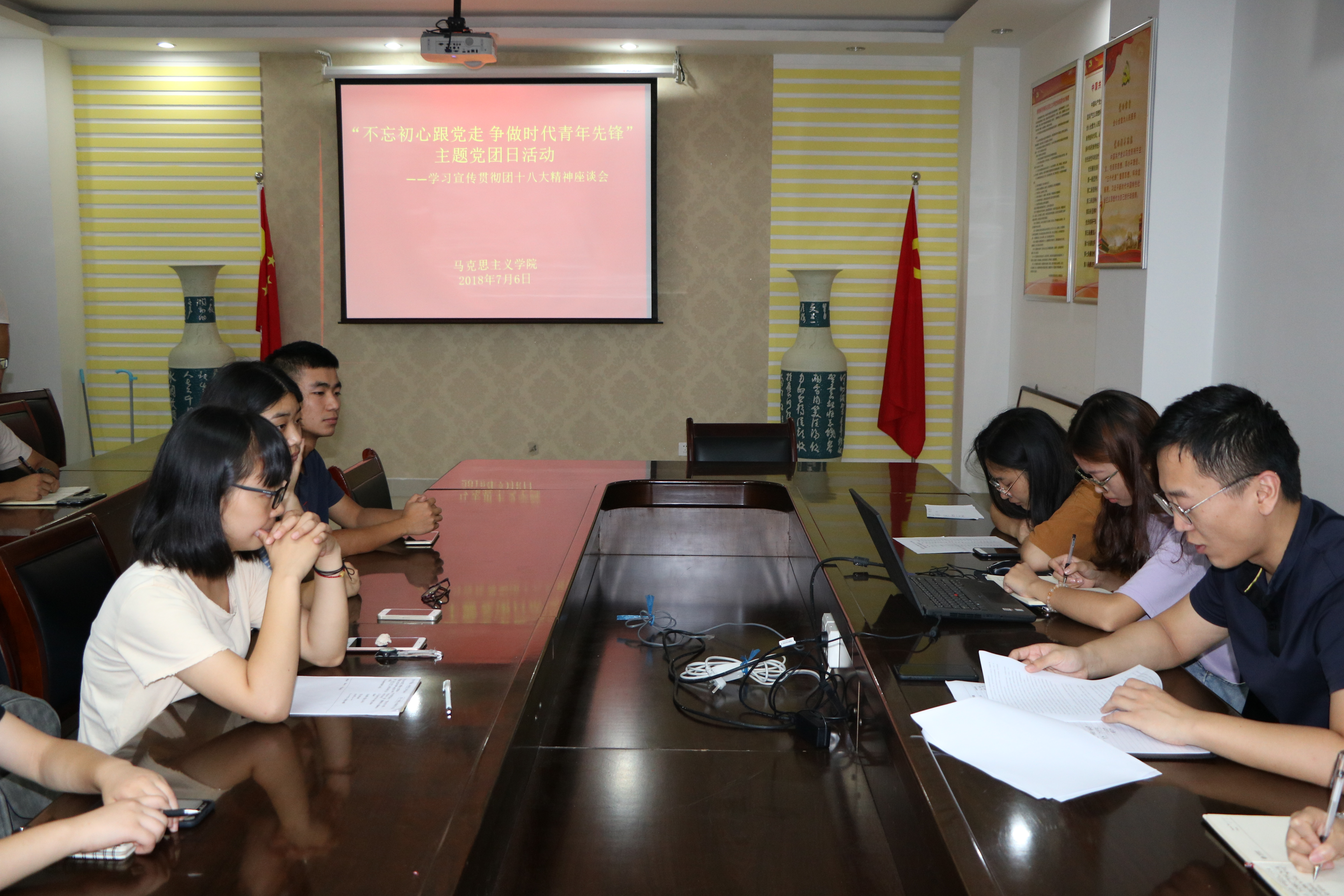 为加强对广大青年团员的教育,学习贯彻习近平新时代中国特色社会主义思想和党的十九大精神,7月6日下午,永利集团官网于323会议室开展了“不忘初心跟党走,争做时代青年先锋”主题党团日活动,组织团员青年学习座谈中国共产主义青年团第十八次全国代表大会精神。永利集团官网团委书记曹栋与20名团员代表共同参加了此次会议。会议由曹栋主持。