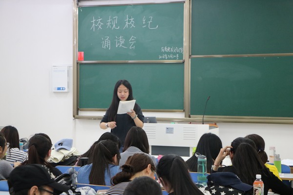 为深入贯彻学习《信阳师范学院学生管理相关规定》文件的精神,4月10日,永利集团官网2015级、2016级全体学生在社科楼514、515教室举行校规校纪诵读学习活动。