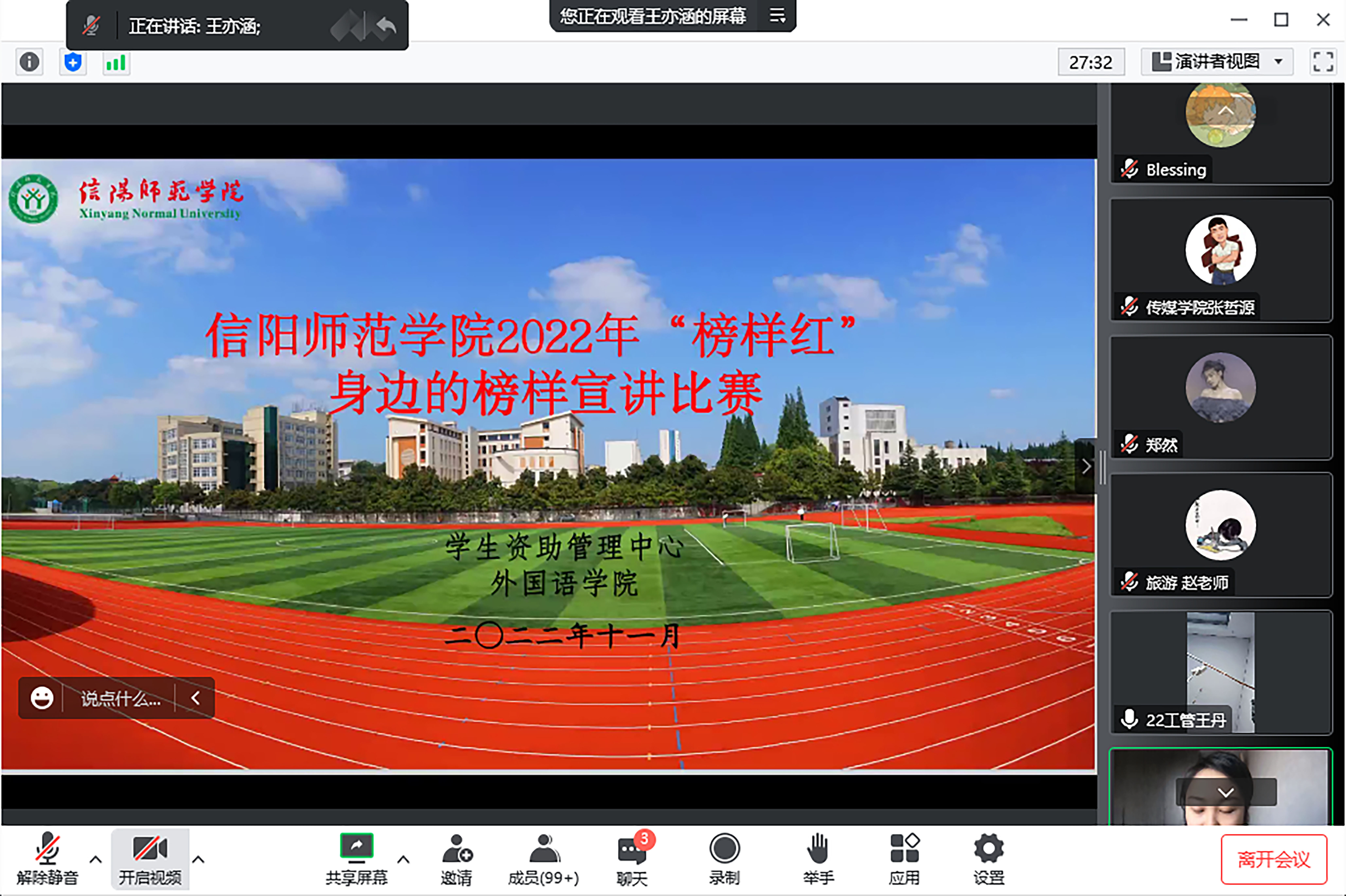 11月30日下午,永利集团官网在腾讯会议上开展“身边的榜样”宣讲活动。宣讲人传媒学院校园明星张哲源、音乐与舞蹈学院自强之星李佳潞、外国语学院国家奖学金获得者王亦涵和永利集团官网2021级、2022级全体学生共同参加此次宣讲活动。活动由旅游学院团委书记赵子鉴主持。