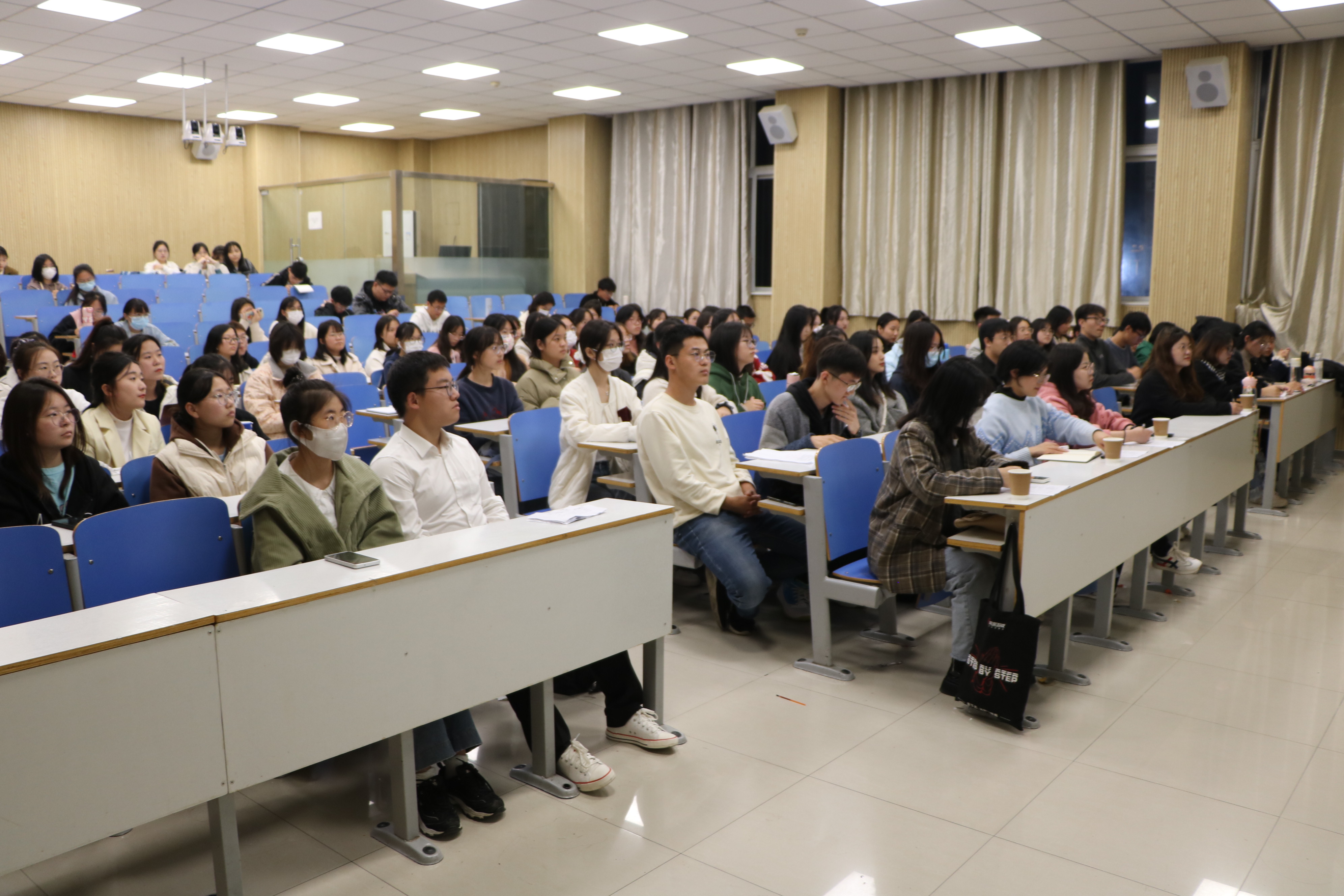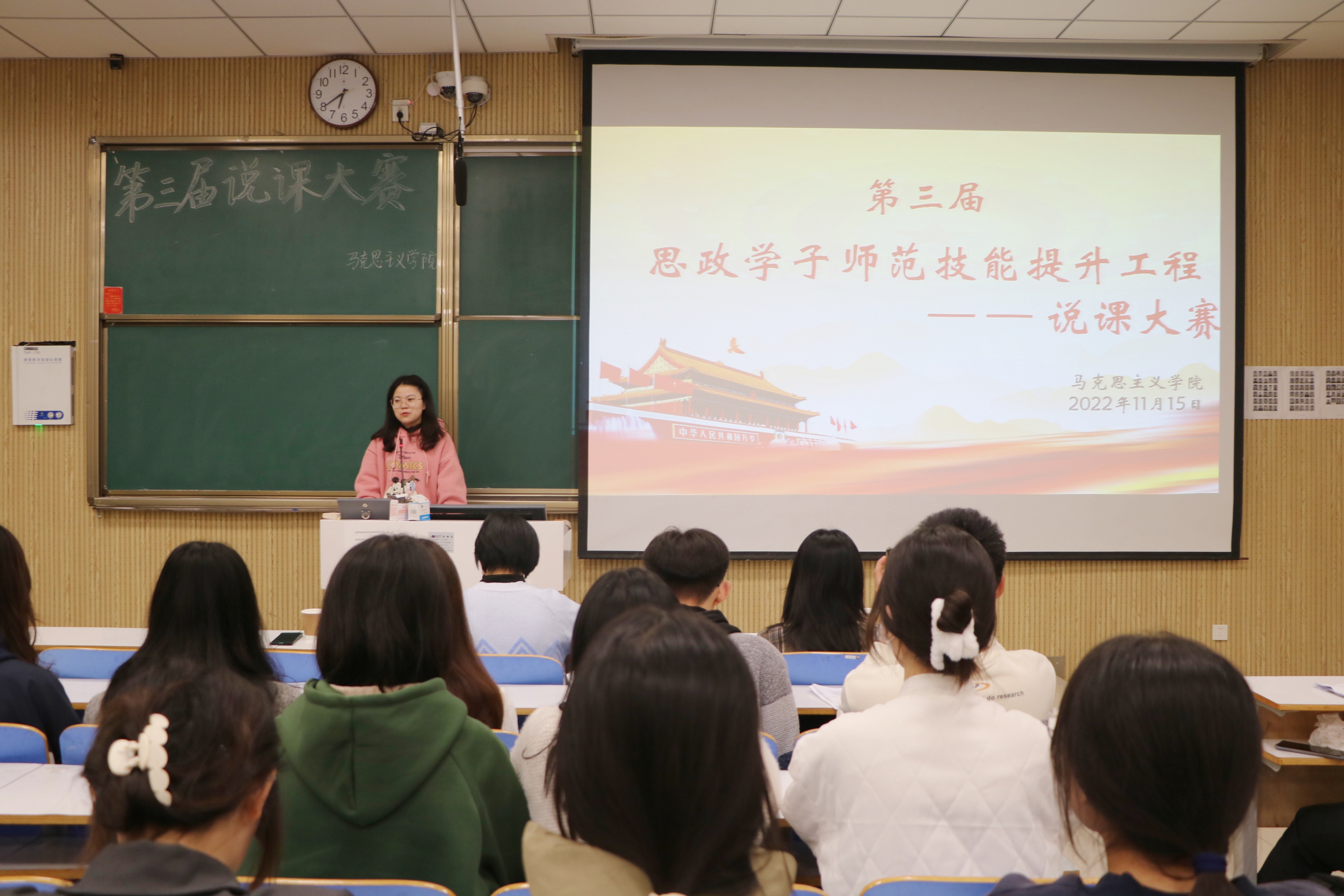 此次说课大赛共有19组选手参加,分为上、下两场。各选手采用PPT与板书相结合的方式,围绕教材分析、学情分析、教学方法、教学过程、板书设计、教学反思等方面进行讲解。比赛过程中,选手们讲述流畅、思路清晰,同时将思政元素自然地融合到教学中,给现场的观众和评委留下了深刻印象。其中,卢茜雨选手以“少年有梦”为主题进行说课,通过歌曲引发学生们对梦想的思考,进而引入教学主题,教学形式新颖有趣、教学内容层层深入,阐明了以少年梦托举中国梦的时代课题;梁钰博组以“中国担当”为题展开细致讲解,从说教材入手,逐层深入引导学生感悟担当的伟大力量,并提出要以“全球视野、世界眼光”来辩证看待国家关系,引导学生进一步了解中国在国际中的积极作为和大国担当。比赛临近尾声,高小佳指出,说课大赛为大家提供了一个锻炼能力和展示风采的平台,使同学们在加强沟通与合作的同时赛出精彩、赛出水平,不断提升实践应用能力和创新能力。