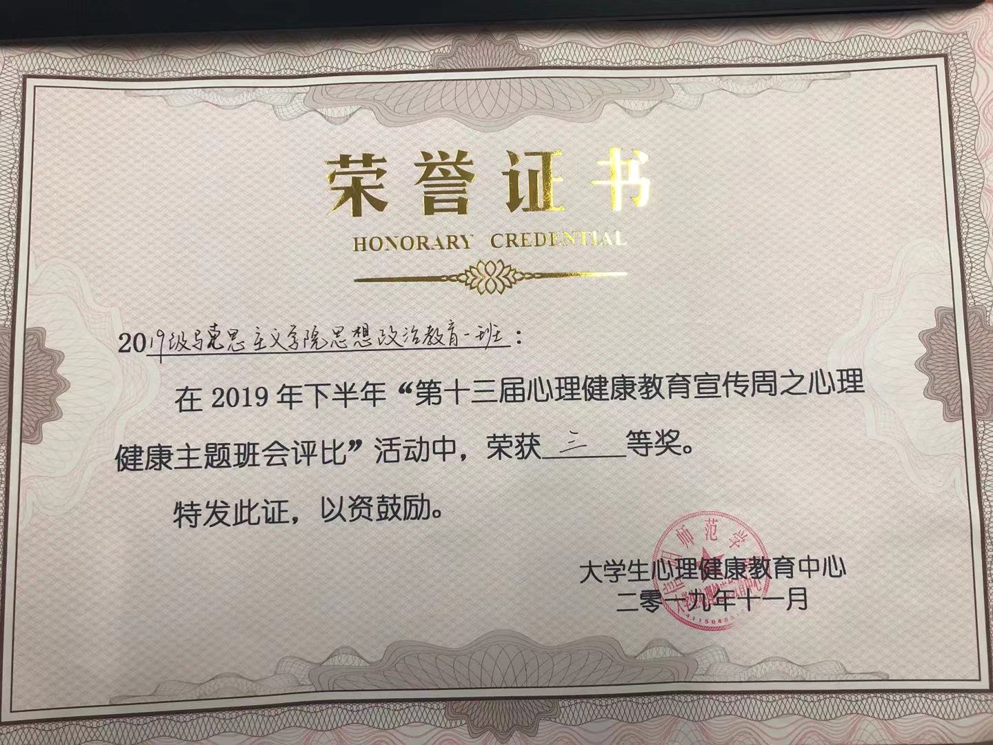12月28日晚,信阳师范学院大学生心理健康教育中心在人文楼报告厅举办“信阳师范学院大学生心理健康教育中心2020年元旦晚会暨年度表彰大会”活动。经评定,永利集团官网在第十三届大学生心理健康教育宣传周之心理知识展板评比中荣获一等奖,总分位居第三,2019级思想政治教育一班在第十三届大学生心理健康教育宣传周之心理健康主题班会评比中荣获三等奖,永利集团官网学生铁兰欣、贾思琦、计新园和乔炜林被评为“心理工作先进个人”。