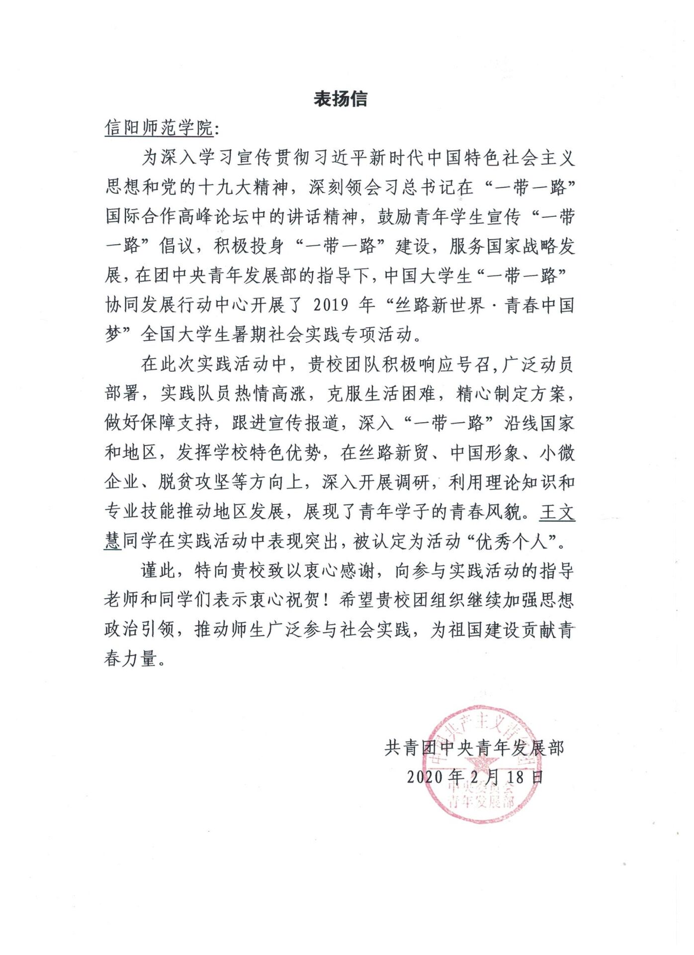 2020年9月21日,永利集团官网收到由共青团中央青年发展部发来的表扬信,信中提及永利集团官网积极响应共青团中央的号召,参与由中国大学生“一带一路”协同发展行动中心开展的2019年“丝路新世界·青春中国梦”全国大学生暑期社会实践专项活动,团队队员热情高涨,充分展现永利集团官网学子的青春风貌。