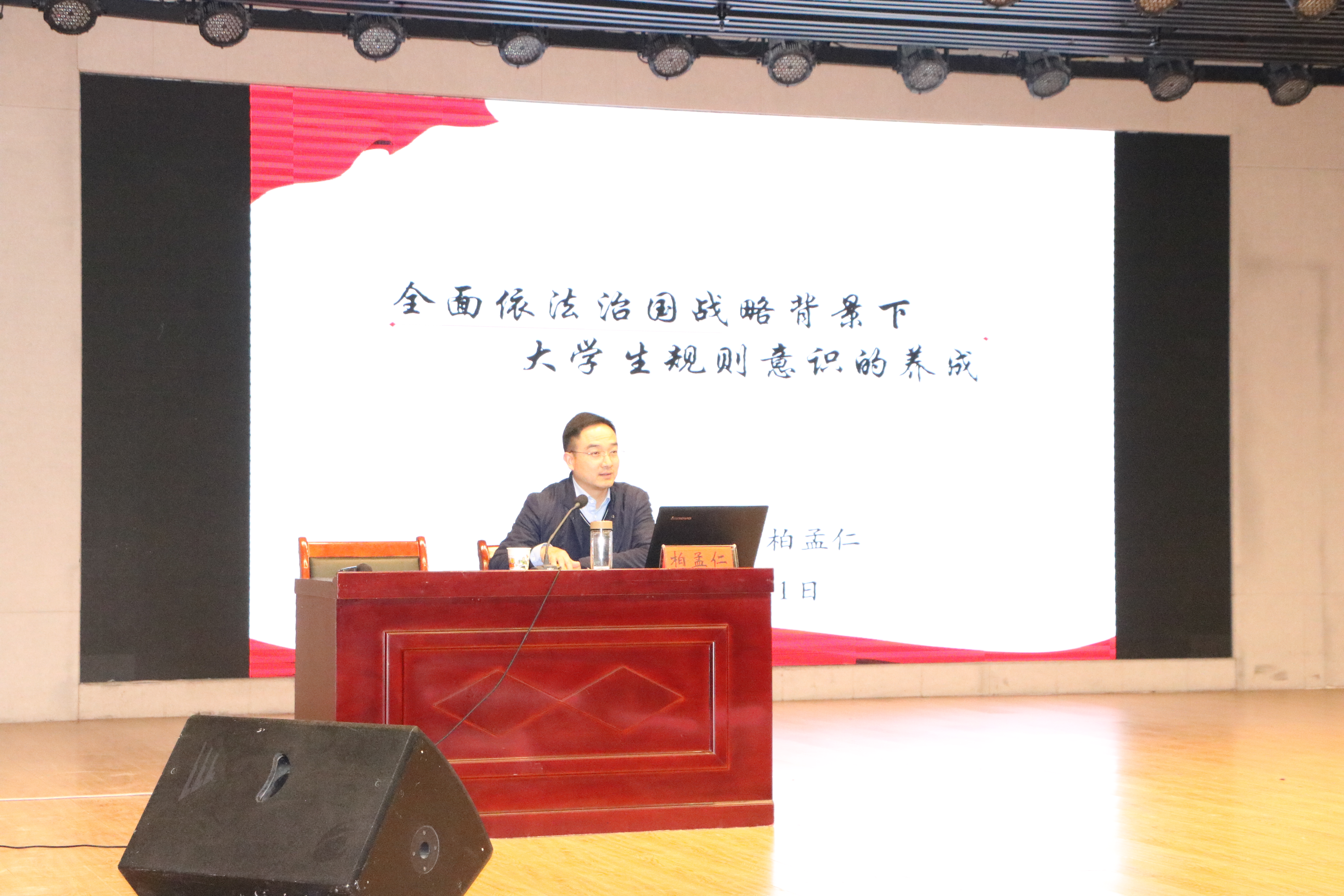 首先,柏孟仁从自身求学经历出发,引导同学们思考规则存在的意义,强调当代大学生养成规则意识的重要性。接着,柏孟仁从“全面依法治国战略的时代及历史背景”、“全面依法治国战略的内涵及现实意义”、“大学生养成规则意识的具体遵循”三个方面进行授课。授课过程中,柏孟仁引用热点新闻,结合具体案例深入分析了在现实生活中规则存在的必要性。他指出,学校应注重培养学生的规则意识,促使学生将遵守规则变成内在需要,充分发挥规则意识在学生成长成才过程中的重要作用。最后,曹栋对柏孟仁的授课内容进行总结并希望新生团员们树立规则意识,自觉遵循规章制度。
