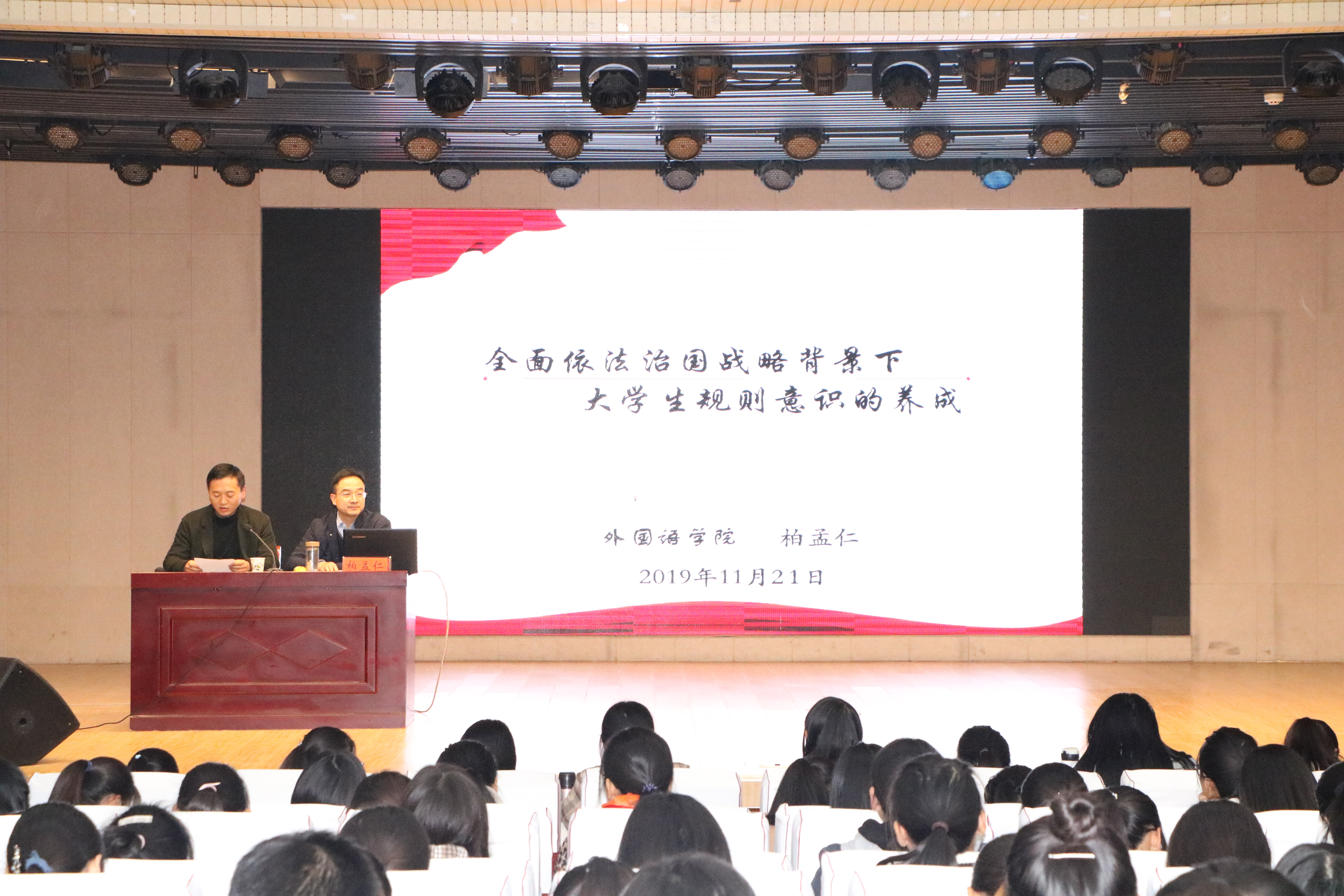 11月21日下午,外国语学院党委副书记柏孟仁在理科楼报告厅为永利集团官网和化学化工学院新生团员讲授题为“全面依法治国战略背景下大学生规则意识的养成”的主题团课。永利集团官网团委书记曹栋、化学化工学院团委老师赵方方及永利集团官网、化学化工学院全体新生团员共同聆听本次团课。