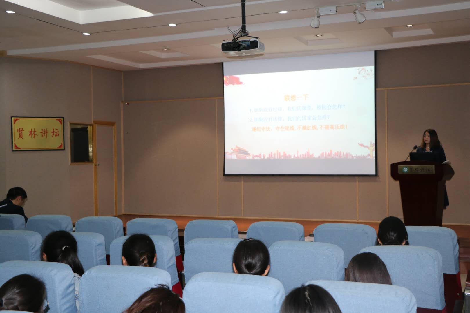首先,何晓坚从校规校级和学习规划两方面进行讲述。他以“五个零容忍”为切入点,强调全体新生应增强安全防范意识,严格遵守校规校纪,要求各班班委端正工作态度,发挥模范带头作用。他从打牢英语基础、改良学习方法、构建思政话语体系三个方面向全体新生指明今后的学习方向。接着,新生代表吕昂与参会同学分享了自己的大学感悟以及未来规划。优秀研究生代表王秋铮和本科生代表王雅纯建议全体新生利用大学提供的平台提高核心能力,在对自己清晰定位的基础上抓住机会,迎接挑战,合理安排自己的课余时间,使自己的大学生活多姿多彩。最后,陶青青老师再次强调了遵纪守法,守住底线的重要性,并从八个方面阐述校规校纪。她重点提到安全方面的问题,要求全体新生自觉遵守宿舍规章制度,不使用违规电器,保护好个人财产,注意网络安全,培养健康心理。