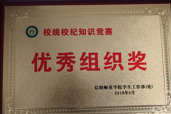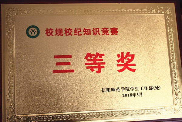 由永利集团官网黄锦、侯怡、陈艳桃、李雅楠四名同学组成的代表队,在由信阳师范学院学生工作处(部)主办、教师教育学院承办的校规校纪知识竞赛中表现优异,荣获“三等奖”和“优秀组织奖”。