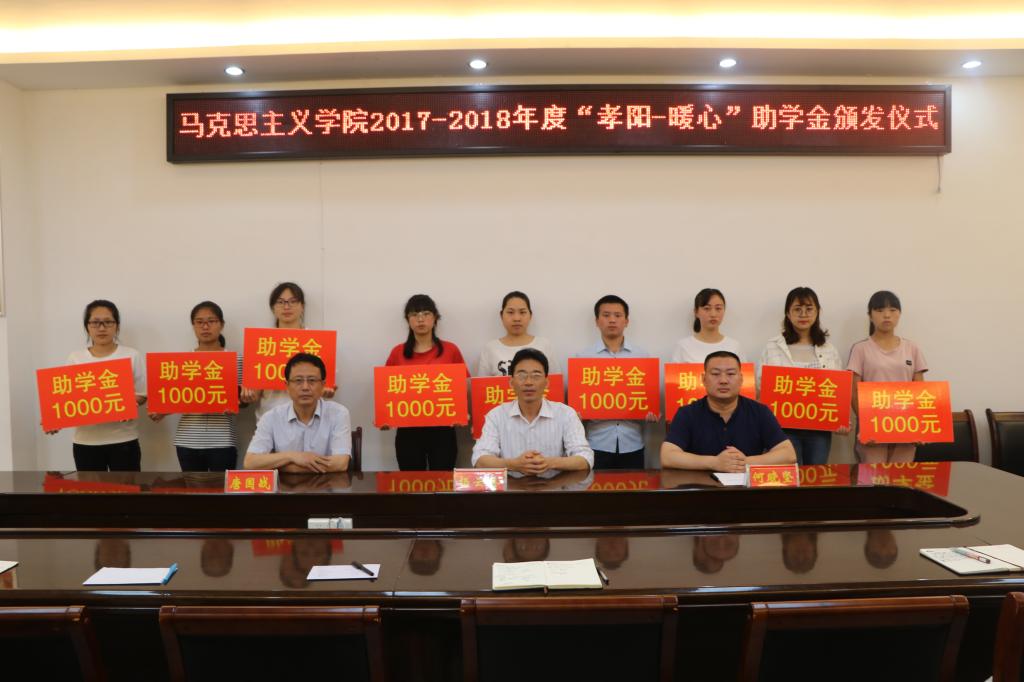 为帮助家庭经济困难学生顺利完成学业,激励他们努力进取、勤奋学习,5月29日下午,永利集团官网在社科楼323会议室举行永利集团官网2017—2018年度“孝阳―暖心”助学金颁发仪式。永利集团官网院长杨云善、党委书记唐国战、党委副书记何晓坚、团委老师曹菁菁与本次25名受助学生共同参加。仪式由何晓坚主持。