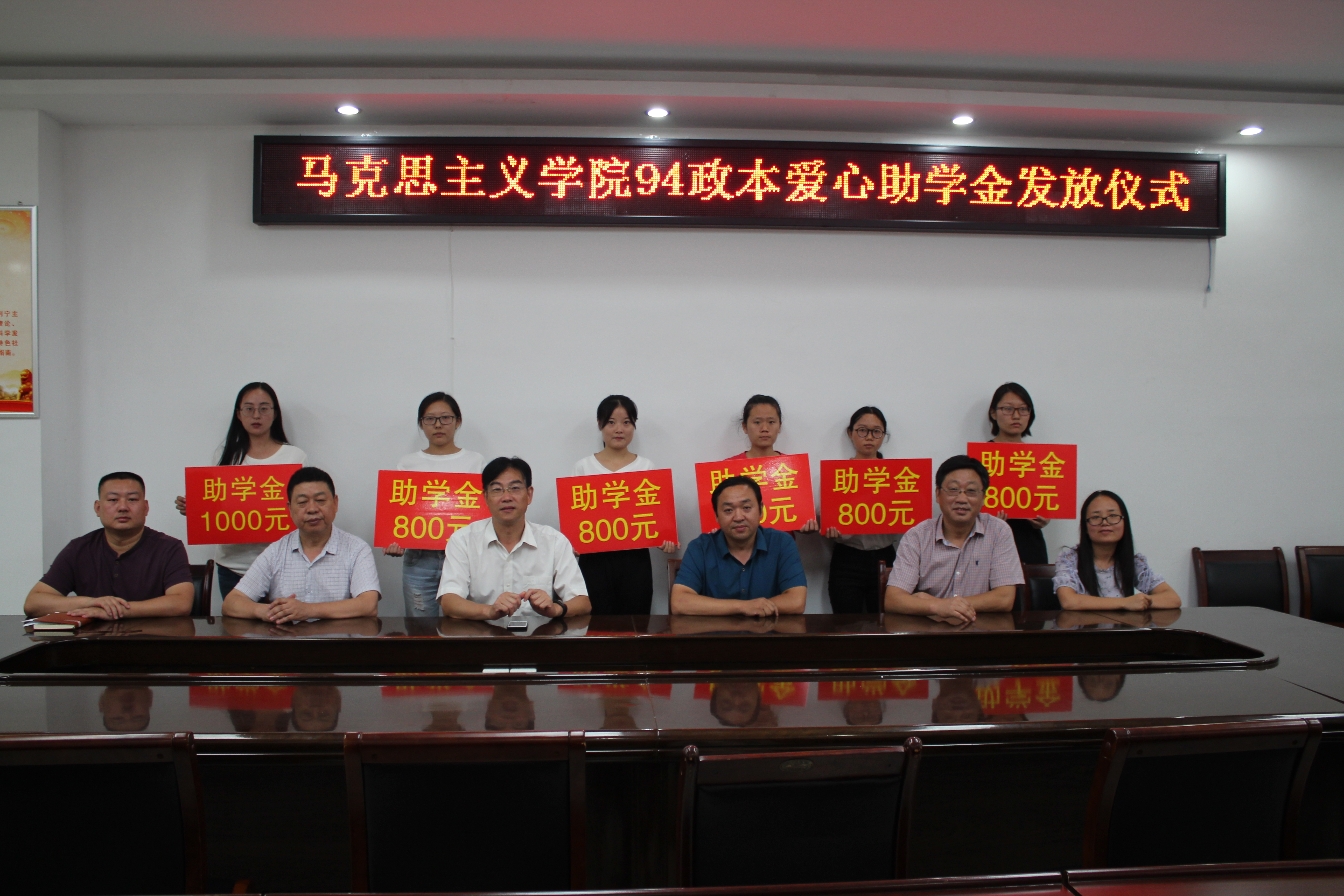 9月7日下午,永利集团官网于社科楼323会议室举行94政本首批爱心助学金发放仪式。94政本校友代表中共信阳市委党校科研处副处长王瑞,学院副院长周智、程晋富,当代马克思主义研究所副所长门献敏,党委副书记何晓坚,团委老师曹菁菁及首批资助对象六位同学共同参与了本次仪式。仪式由周智主持。