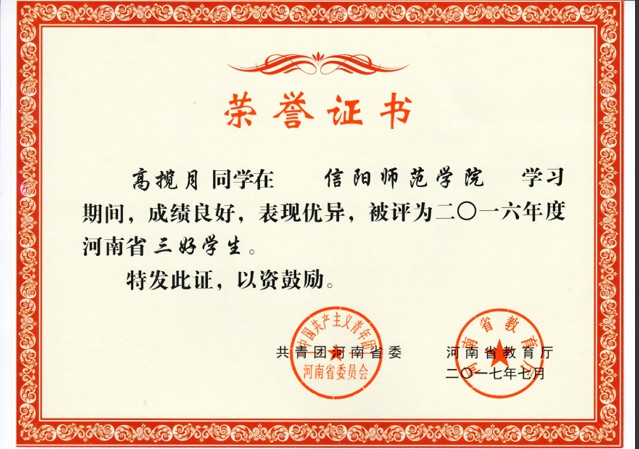 在校学习期间,通过了全国大学英语四级、六级考试、全国计算机二级MS Office应用考试,并在普通话水平测试中取得二级甲等的成绩,连续两学年得国家励志奖学金,在2017-2018年获得校级一等奖学金,单项奖学金两项。