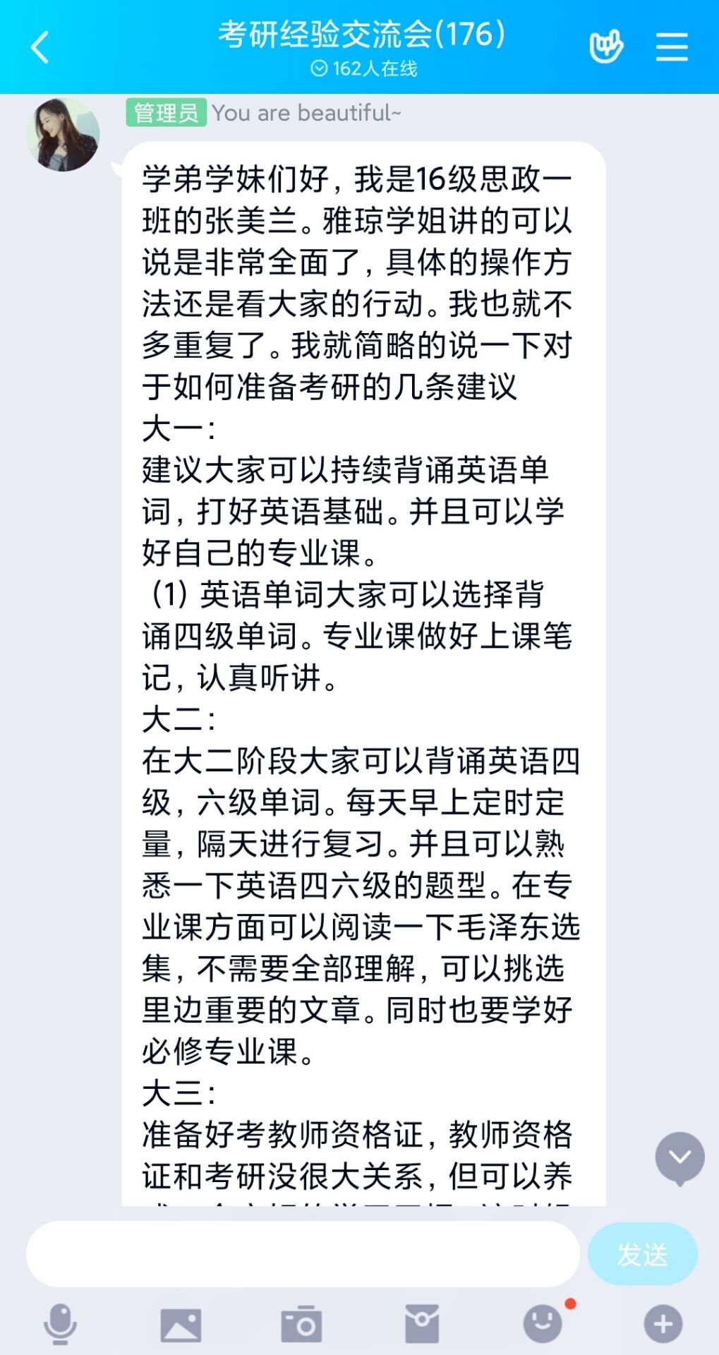 6月11日下午,永利集团官网考研服务社通过腾讯QQ线上平台举办了“以梦为笔,绘美研途”主题考研经验交流会。永利集团官网2016级优秀考研学生代表张雅琼、张美兰以及2018、2019级有意向考研的同学共同参加本次交流会。会议由考研服务社牛笑怡主持。