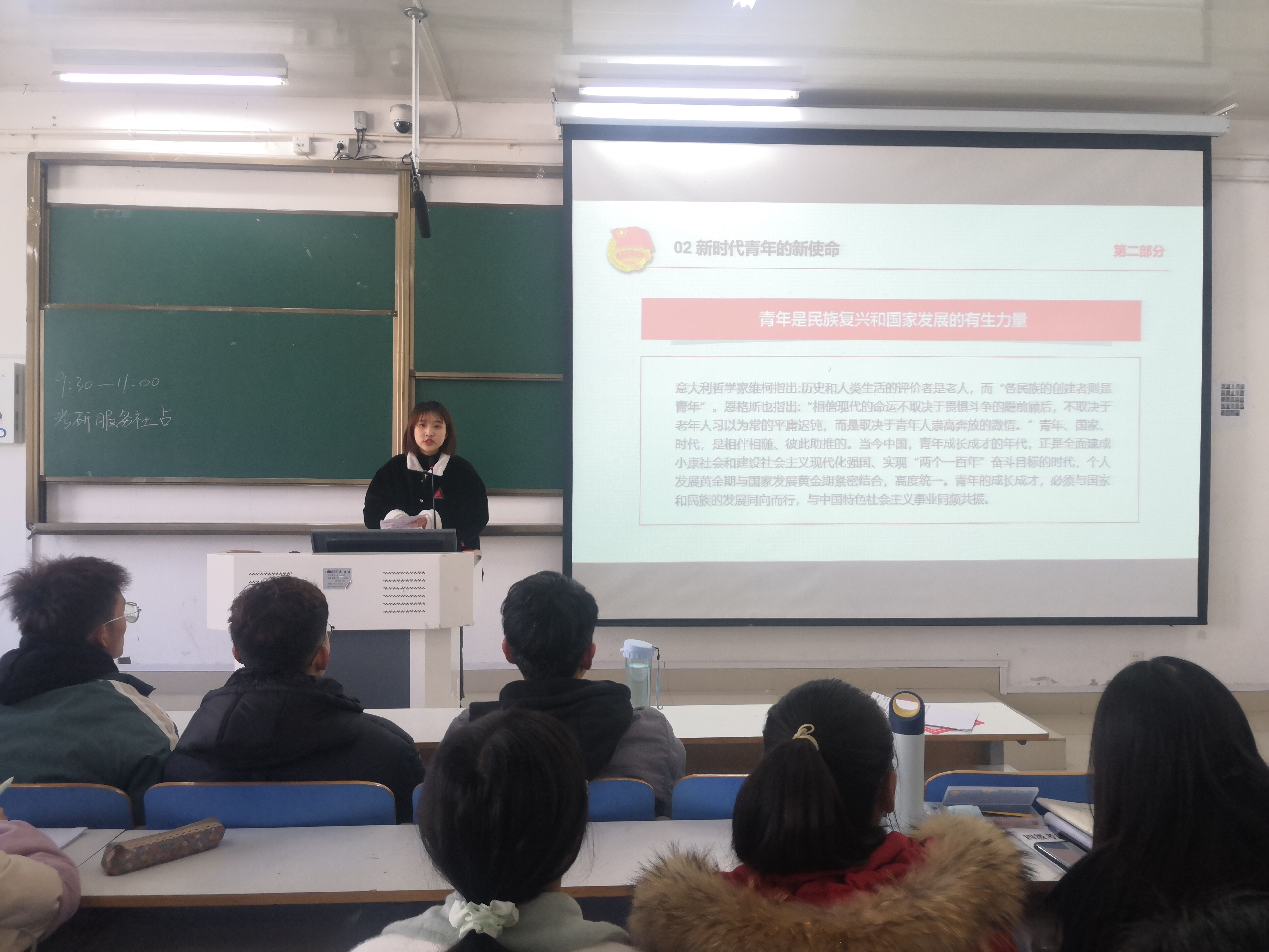 为弘扬社会主义核心价值观,激发青年活力,加强责任感和使命感。12月5日上午10点,考研服务社在社科楼516开展“深入学习贯彻新时期新使命”团课。社团全体成员参加此次“新时期青年新使命”团课。此次团课由团支书徐千涵主持。